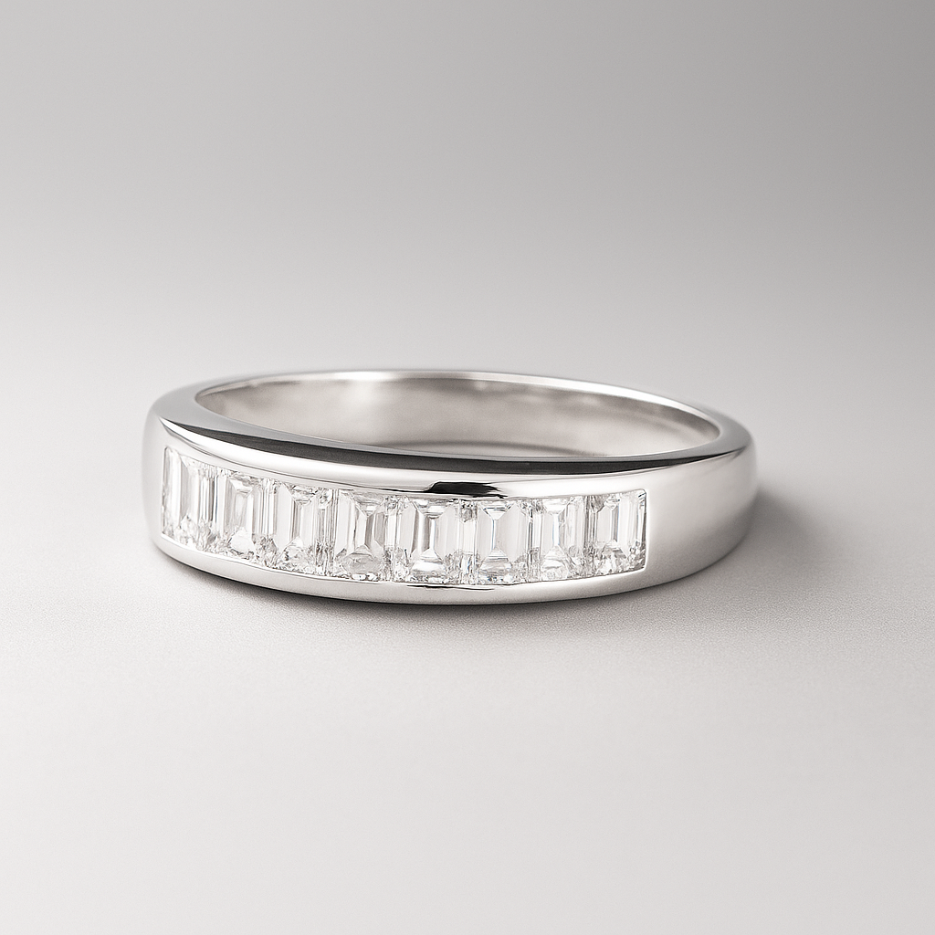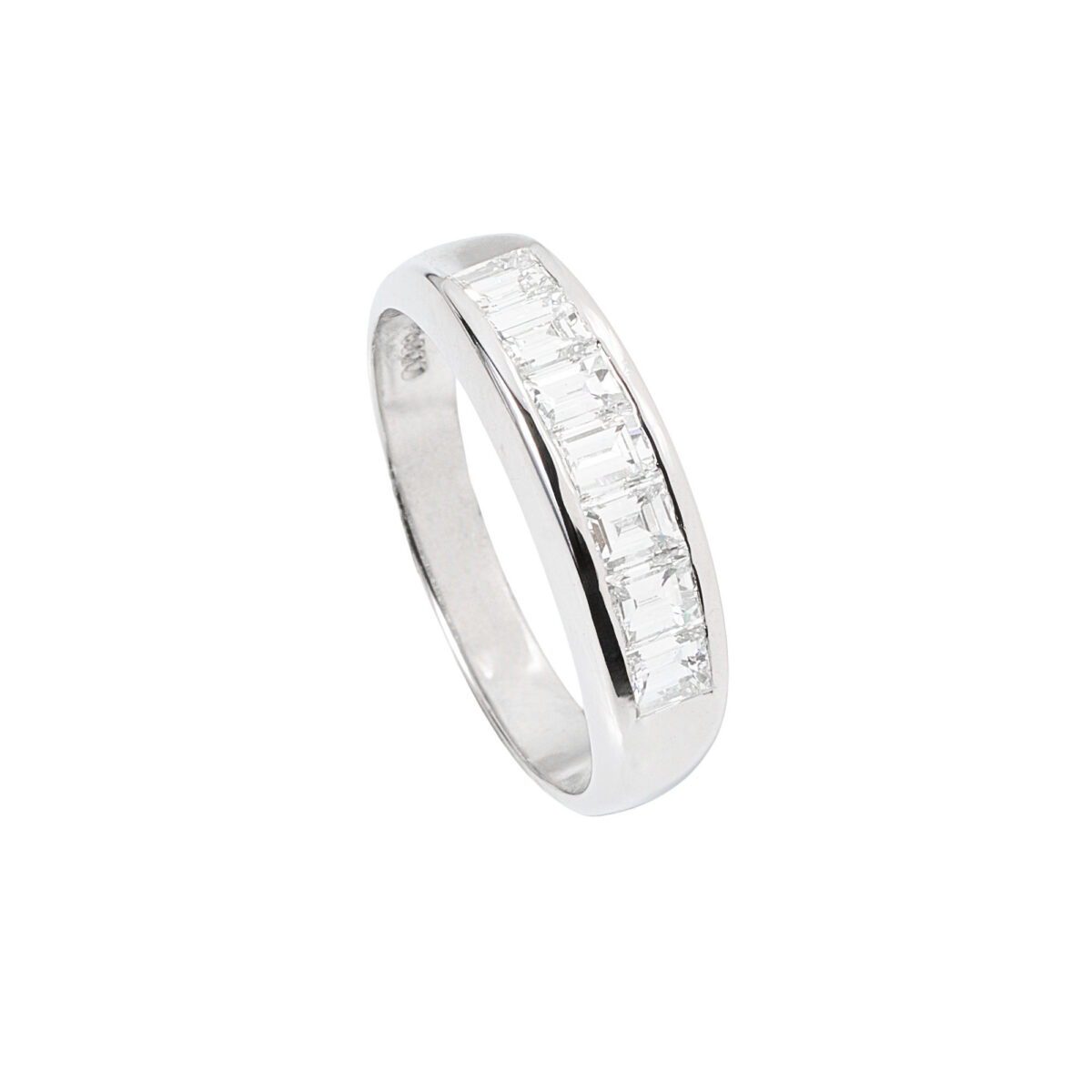 Anillo de Platino con diseño medio cintillo de Diamantes en corte Princess y Baguette engastados en riel n el metal 0.50ct en total. Talla 9
