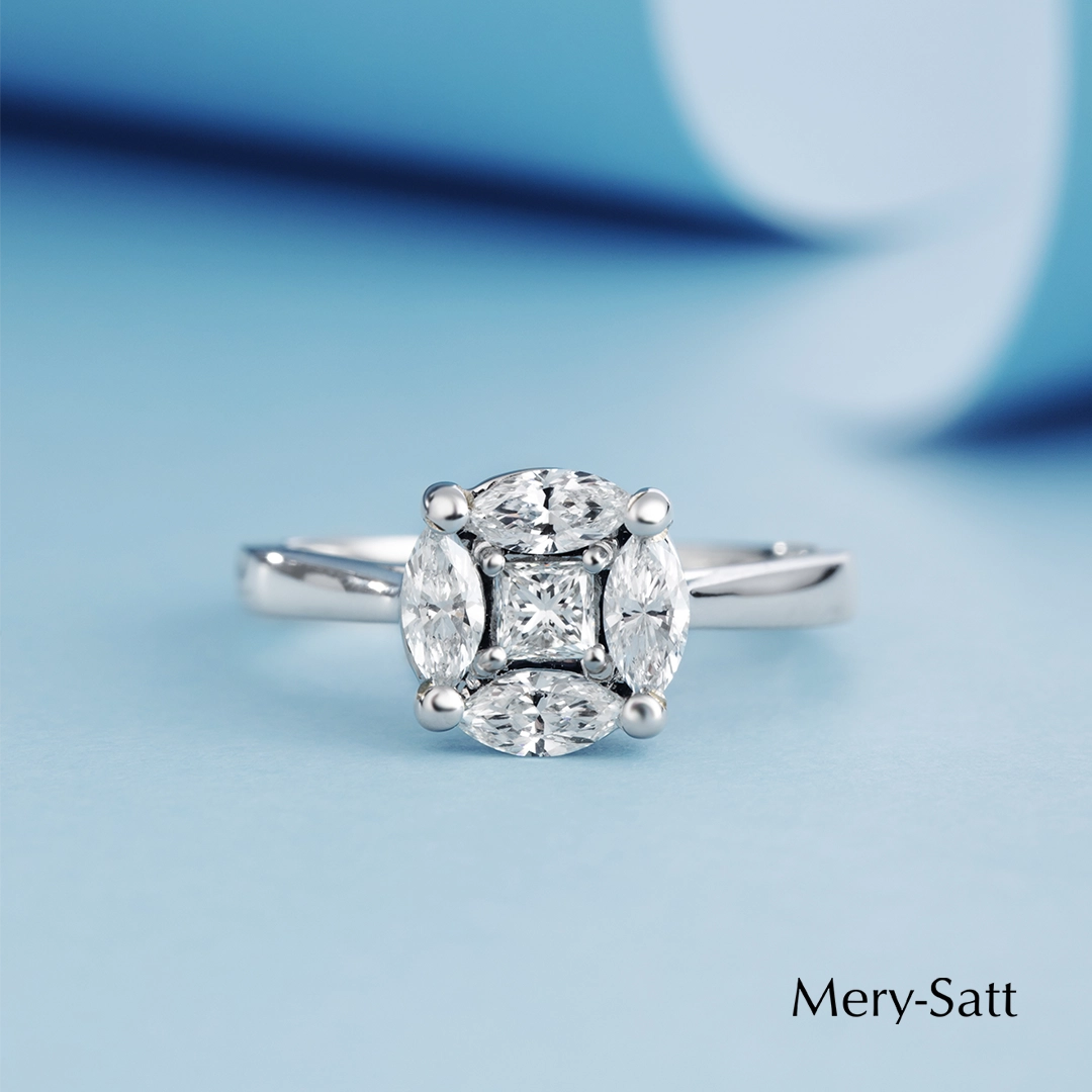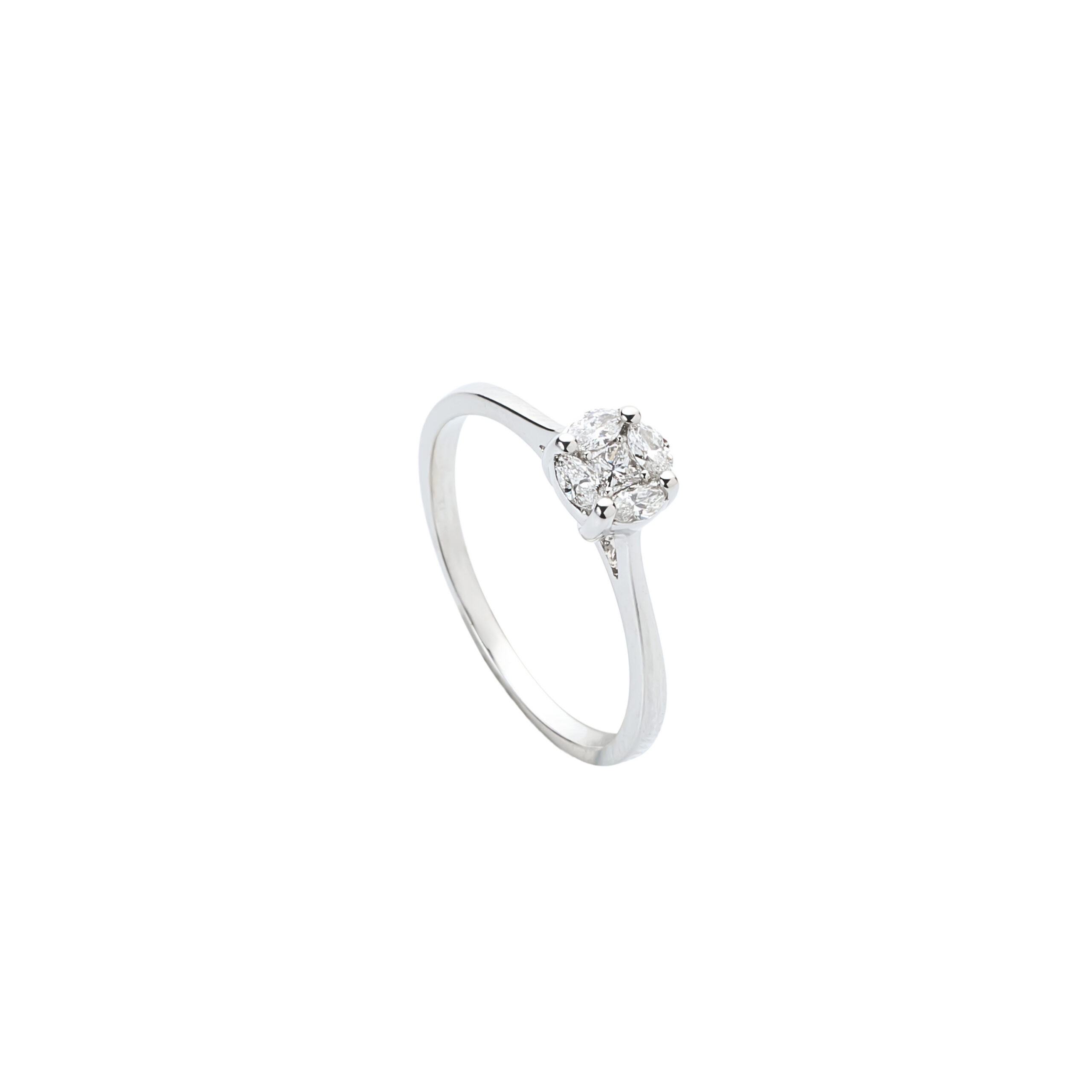 Anillo de oro blanco 18k con 4 diamantes corte Marquise de 0.17ct en total y un diamante central corte Princess de 0.07ct Talla 14
