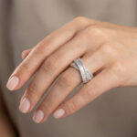 Anillo de oro blanco 18k con diamantes corte brillante 0.42ct y baguette 0.27ct con dos bandas cruzadas entre si. Talla 13