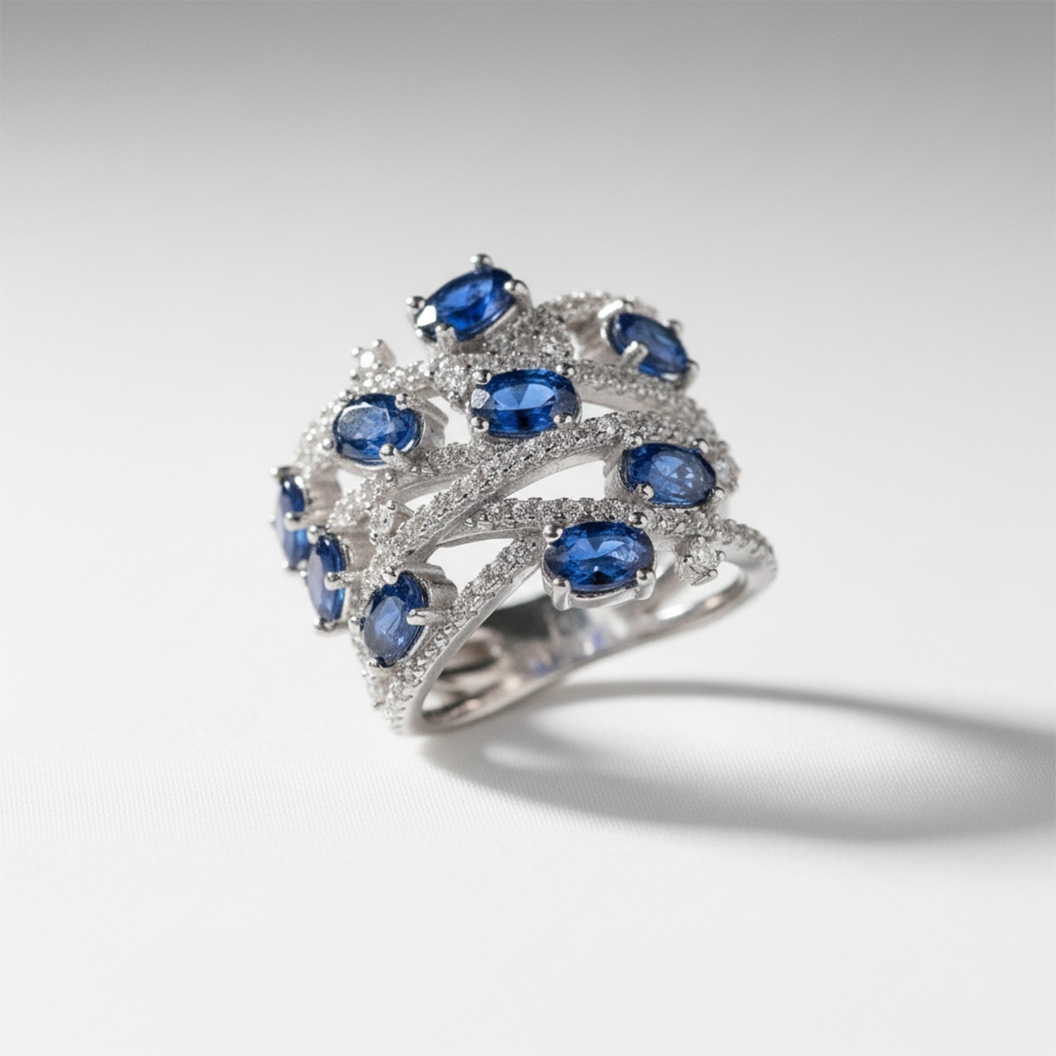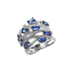 Anillo ancho de zafiros azules naturales en ovalados con lineas de circones blancos engastados en plata esterlina 925. Talla 15