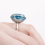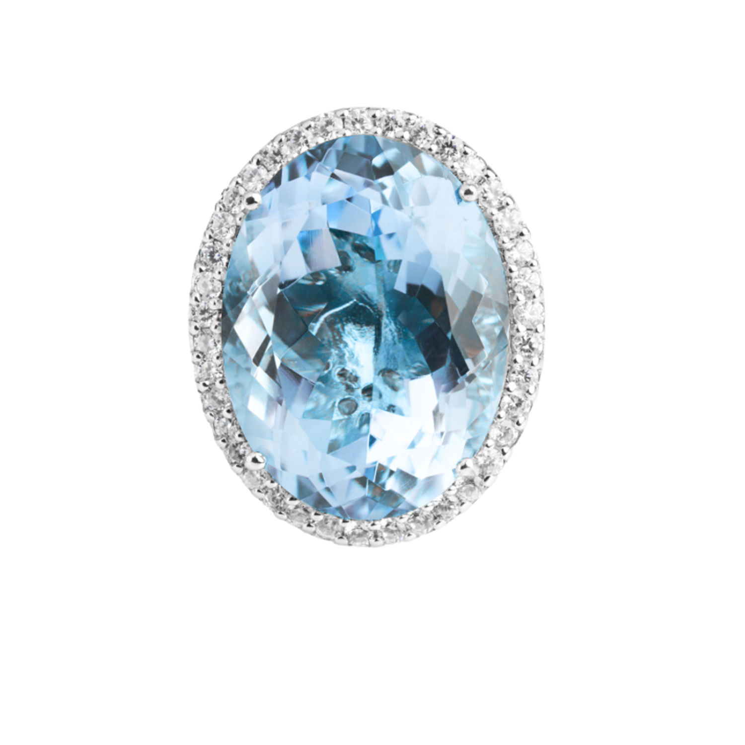 Anillo de la colección Bloom by Karen Doggenweiler diseñado en Plata 925 con Topacio azul corte redondo con un halo de circonita suiza. Talla 12.5