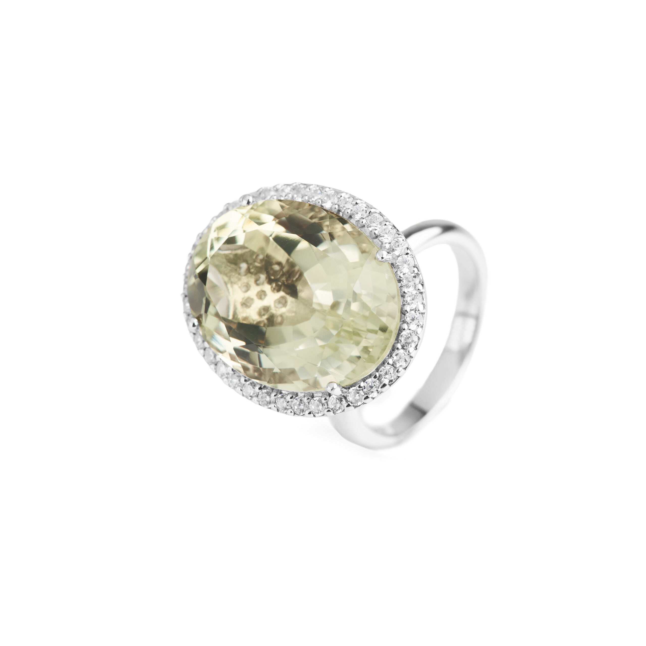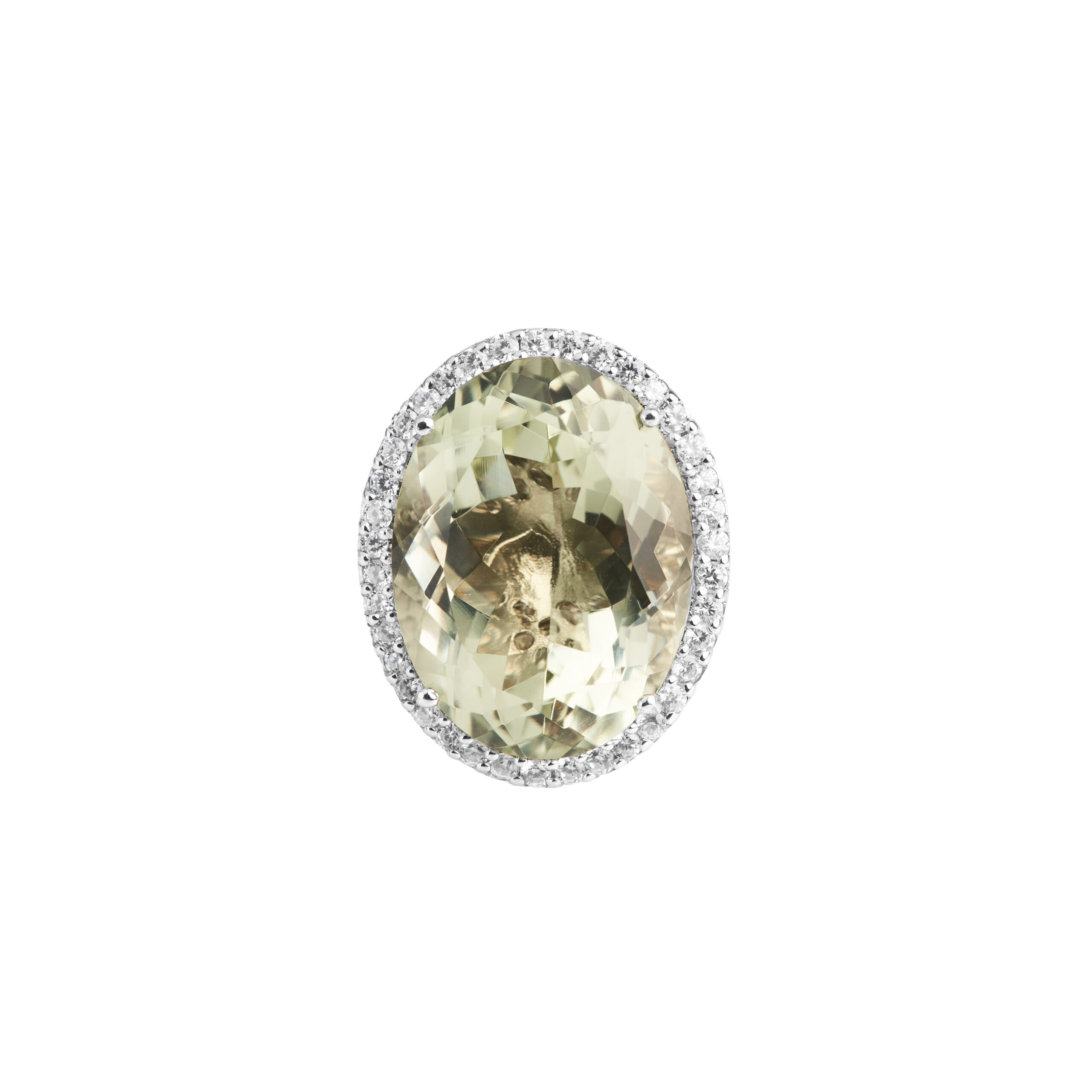 Anillo de Amatista verde  natural corte ovalado engastada en grifa con un halo de circones blancos en plata esterlina 925. Talla 14