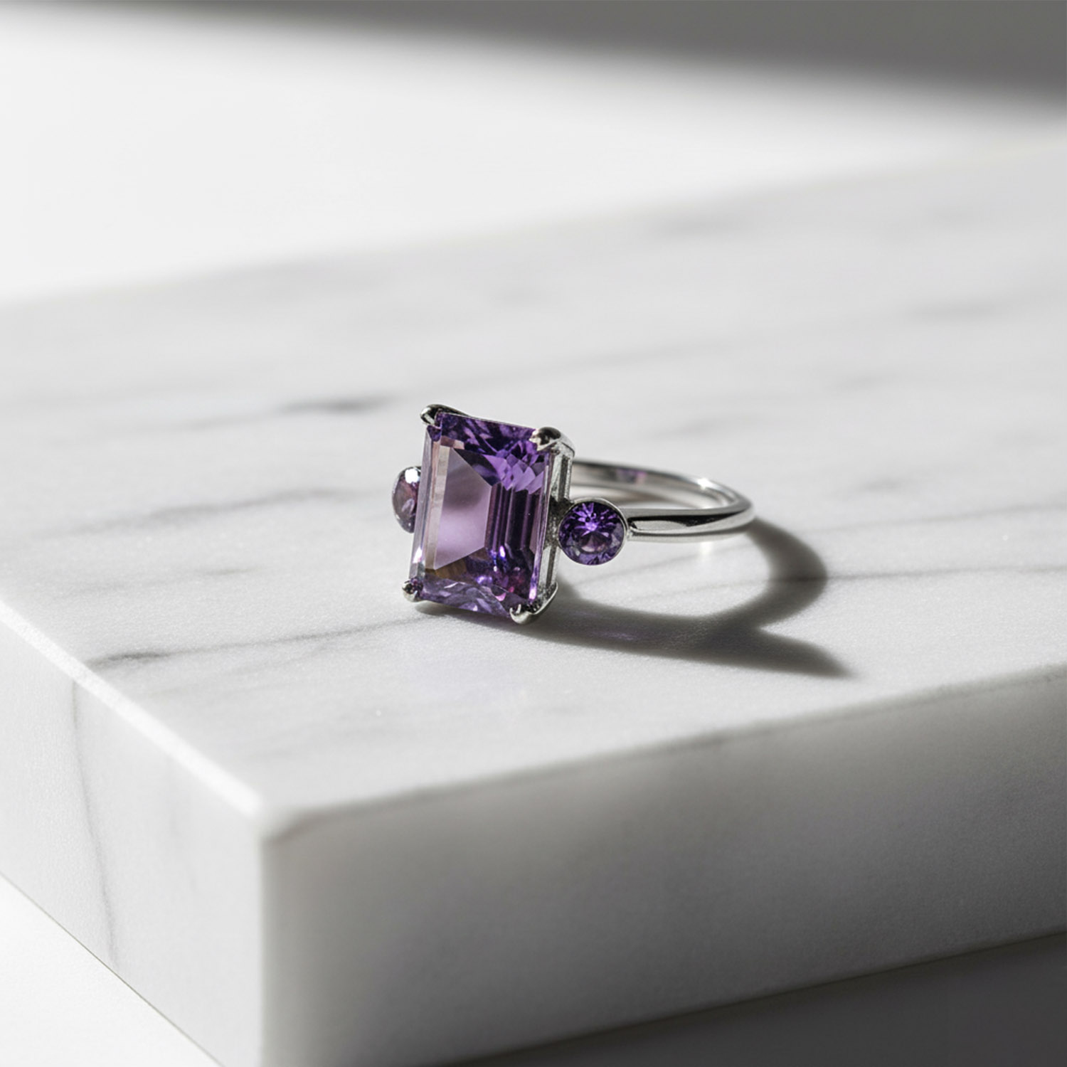 Anillo de amatistas naturales con una central corte esmeralda engastado en grifa y dos corte redondo engastados a bisel en plata 925, Talla 13