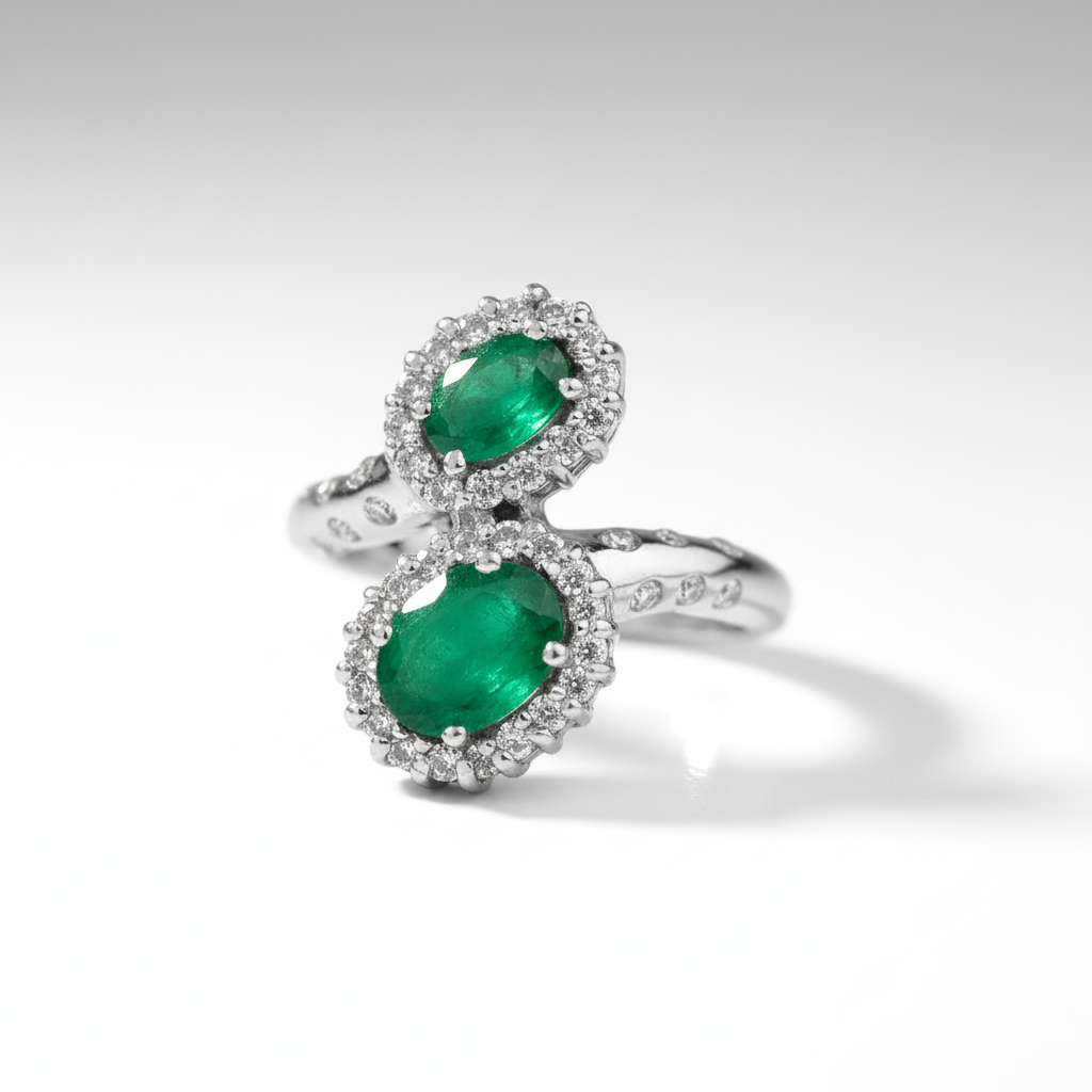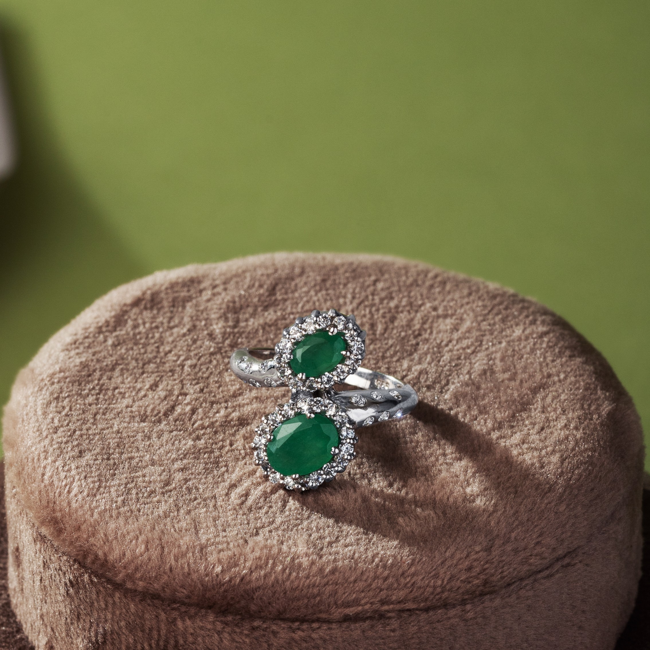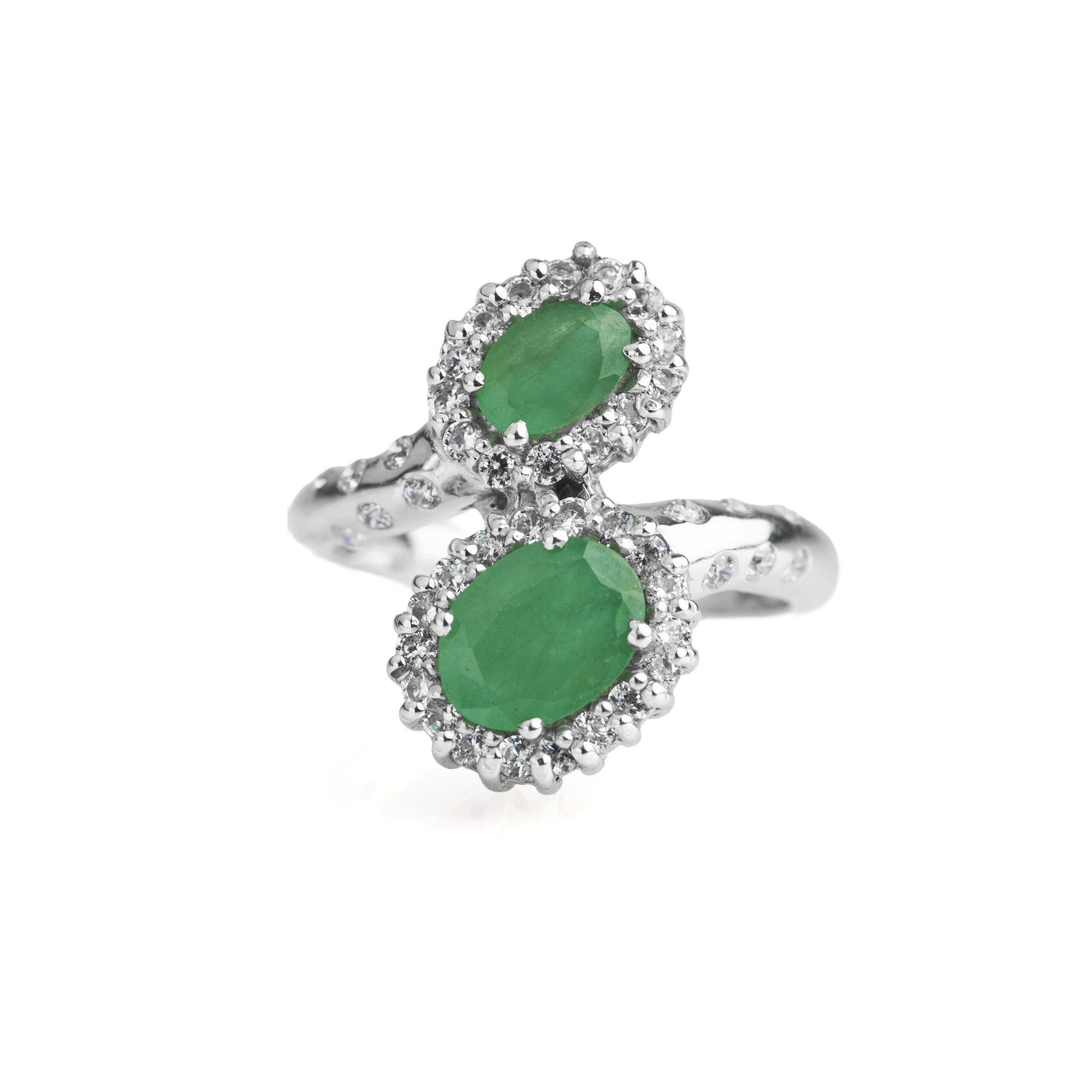 Anillo de esmeralda natural ovaladas engastadas con halo de circones blancos y  con circones blancos en el cuerpo de plata esterlina  925. Talla 11