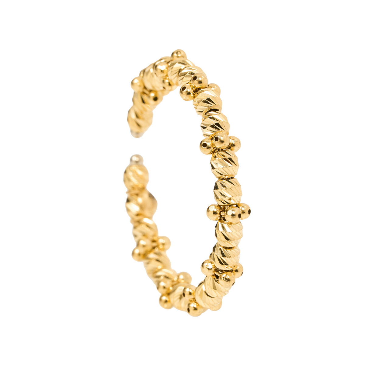 Anillo de oro amarillo 18k con diseño abierto de bolitas de oro con cortes diamantados. Patrón de cuentas 2-1-2