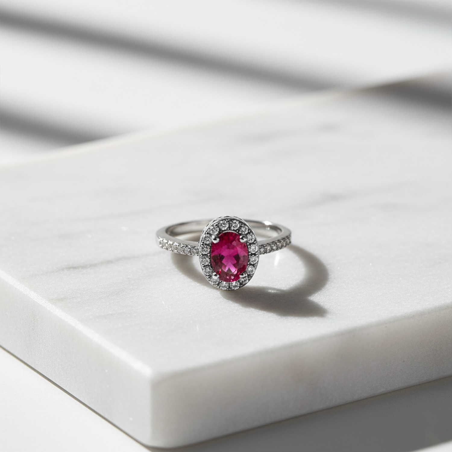 Anillo de rubi natural corte ovalado engastado en grifa con halo de circonita cubica  blanca en plata esterlina 925. Talla 16