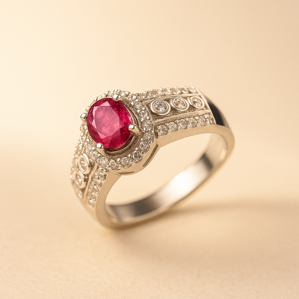 Anillo estilo Reina de  rubi natural ovalado con circones blancos engastados en el cuerpo en pave y bisel de plata esterlina 925. Talla 14