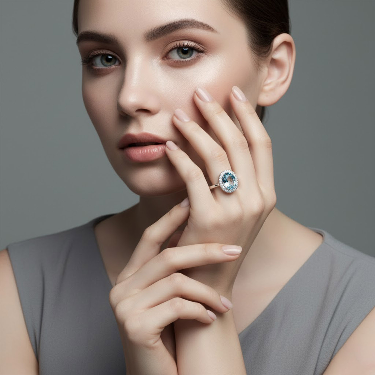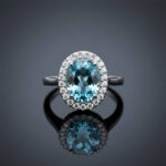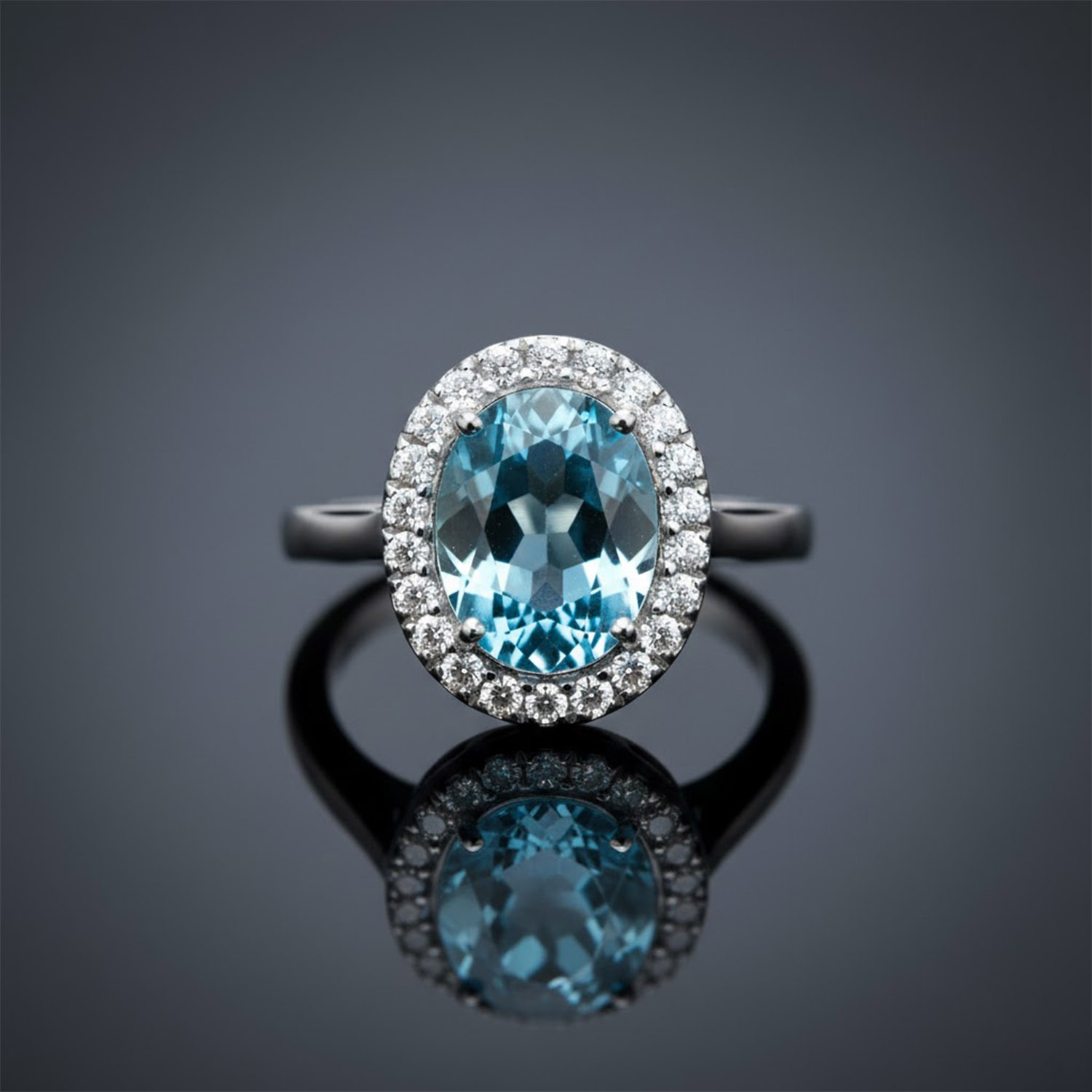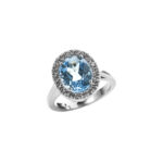 Anillo de topacio azul natural ovalado con un halo de circones blancos en pave cuerpo de plata esterlina 925. Talla 14
