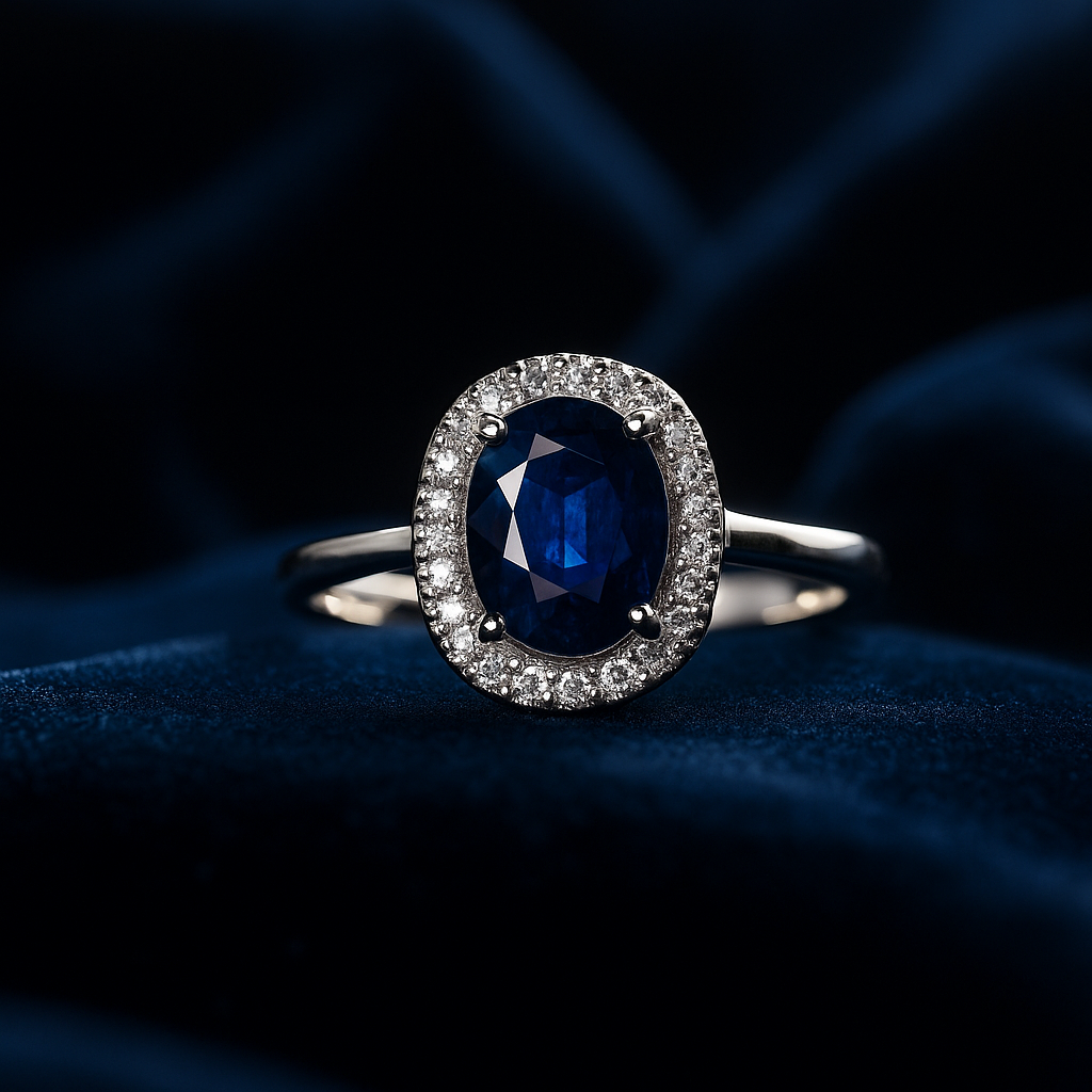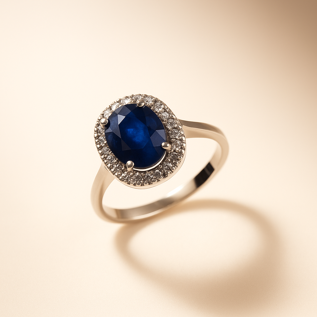 Anillo de plata esterlina 925  con zafiro natural ovalado engastado en grifa con un halo de circonita cubica blanca. En talla 14