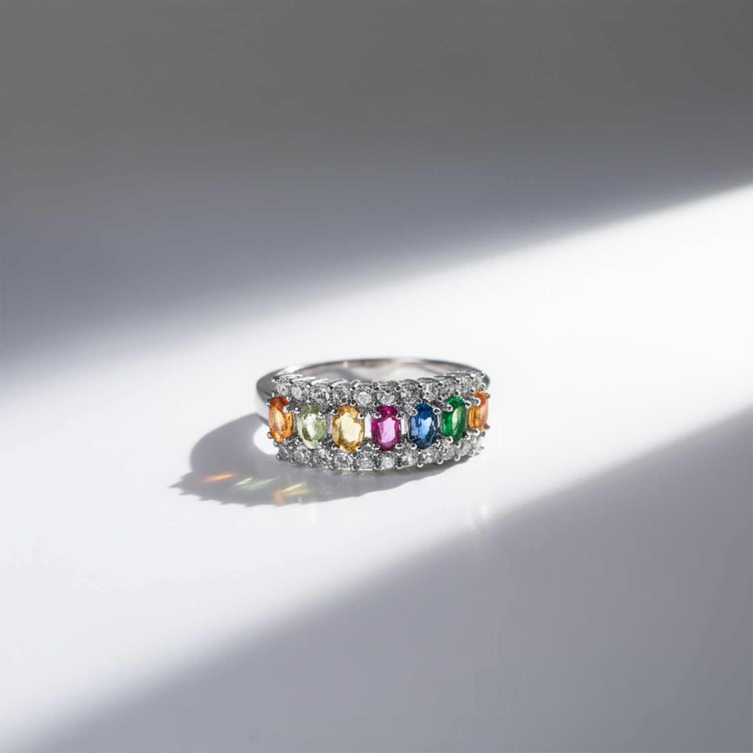 Anillo de zafiros de colores ovalados engastados en grifa con circones blancos estilo medio cintillo de plata esterlina 925. Talla 11