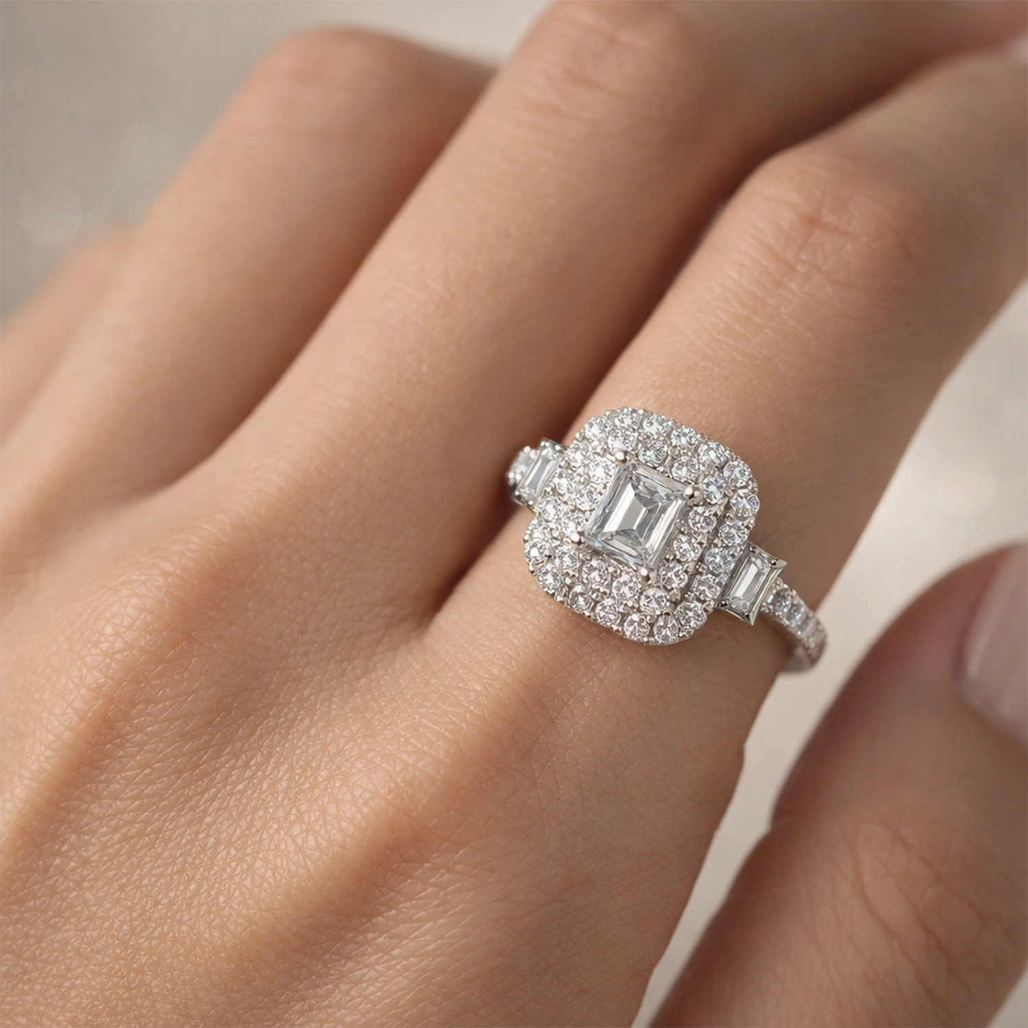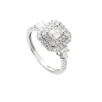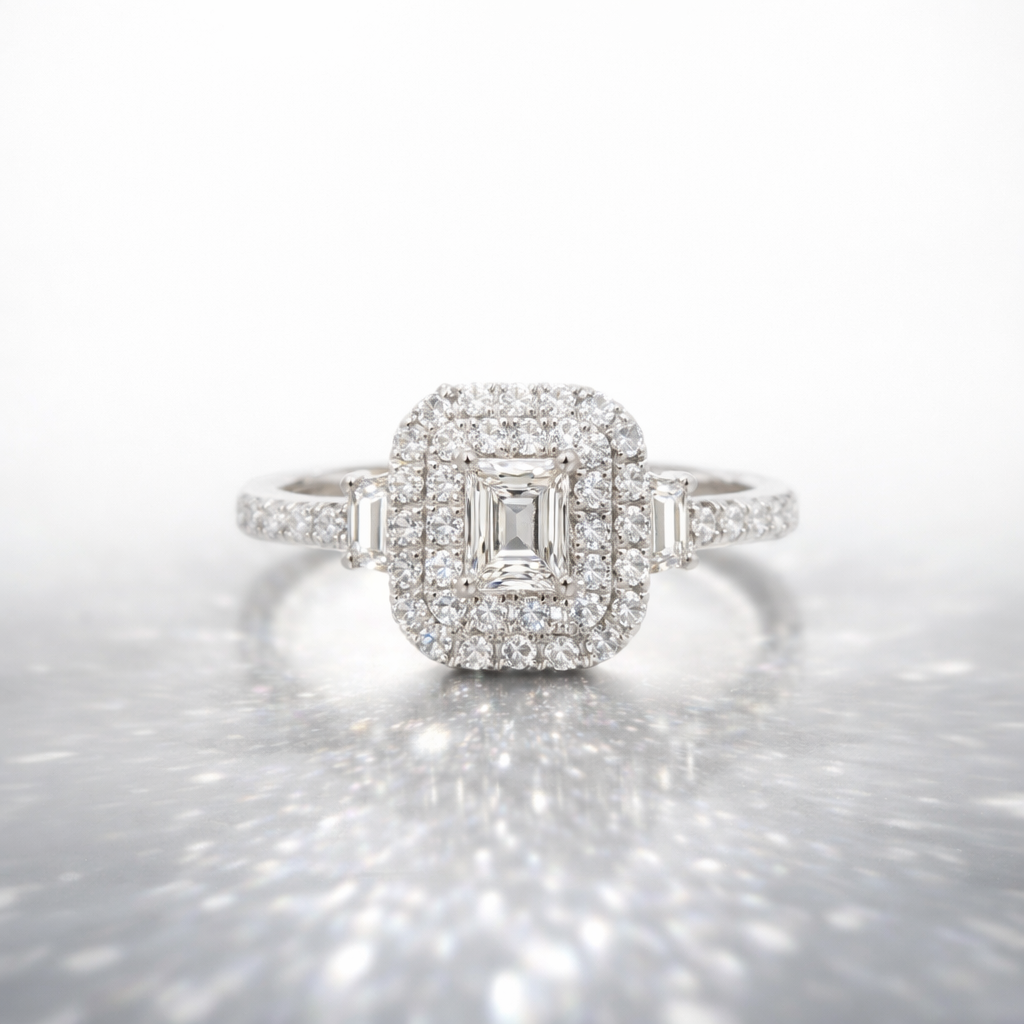 Anillo de Oro blanco 18k estilo sofia con diamante central corte Baguette de 0.19ct y doble halo de brillantes. en total 1.20ct talla 12.