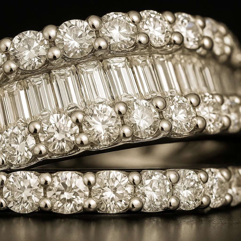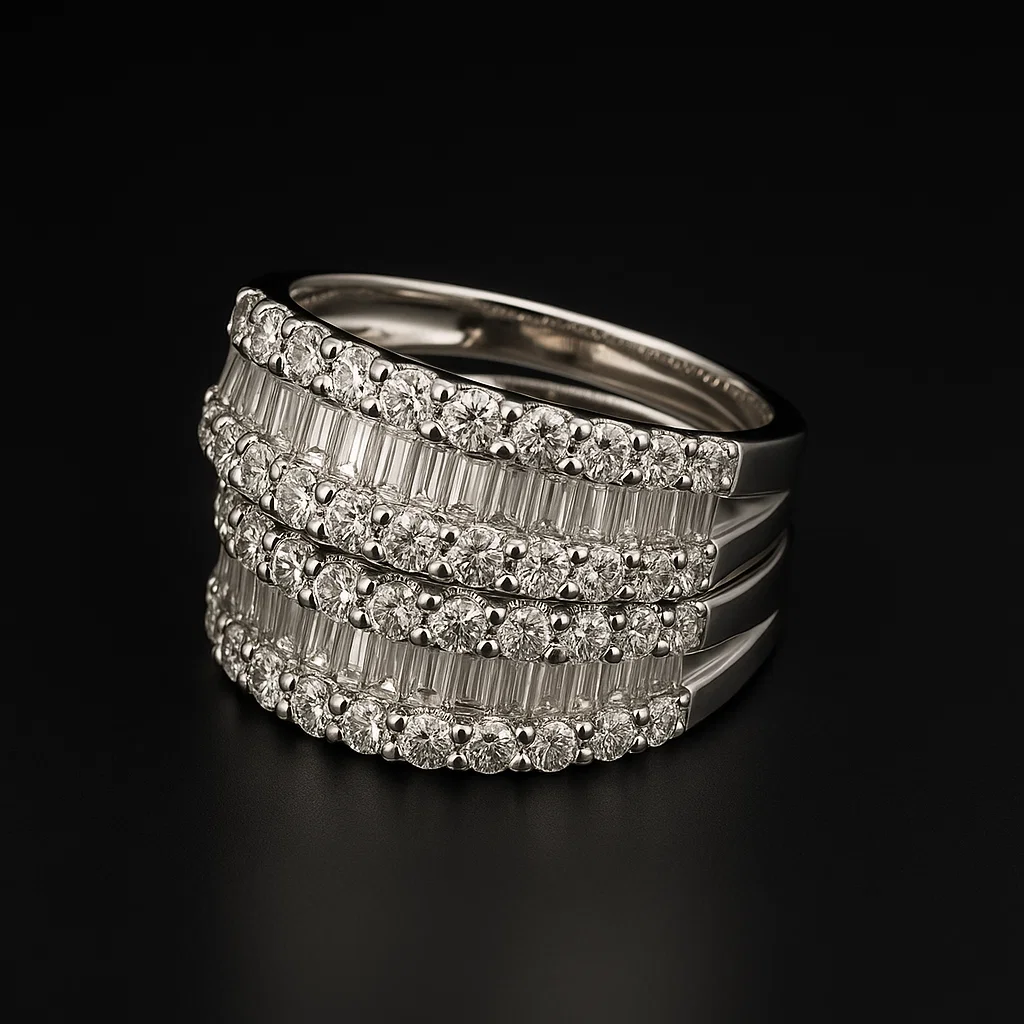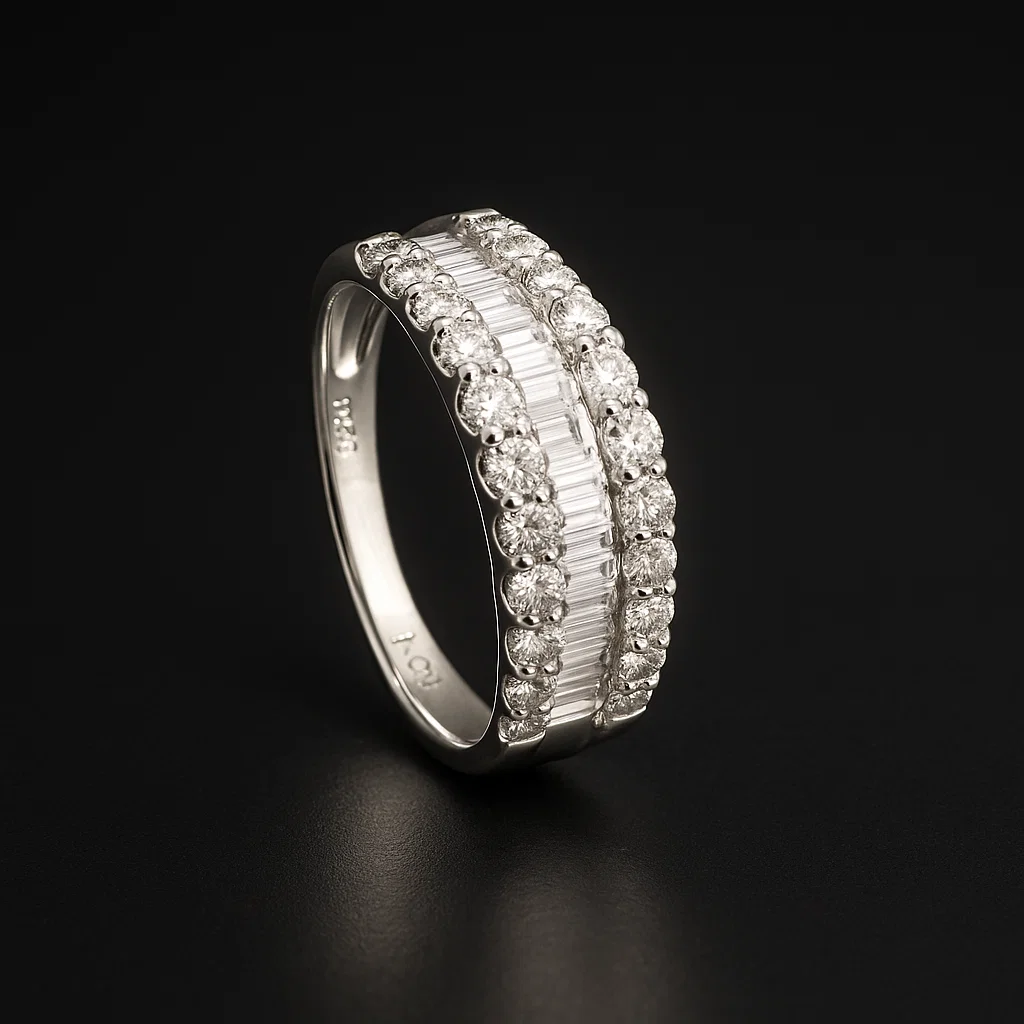 Anillo de Platino con diseño de medio cintillo de diamantes en corte Brillante y Baguette en total 1 quilate. Talla 11