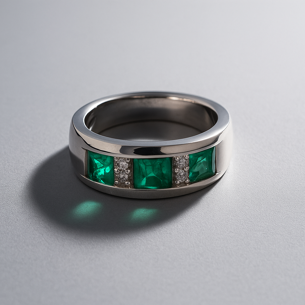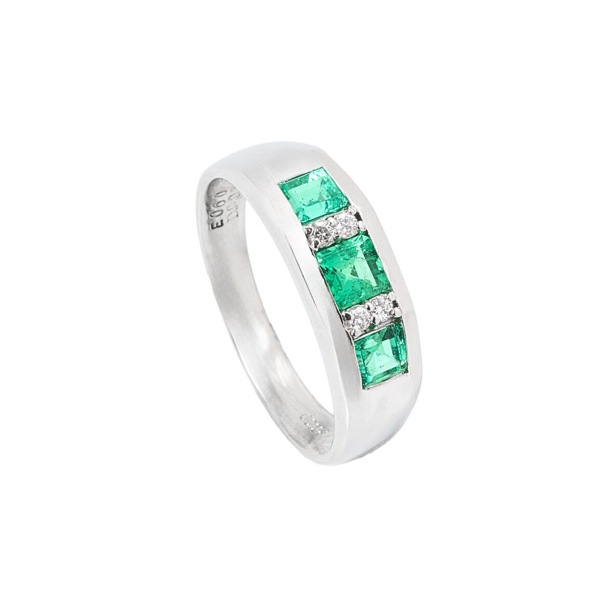 Anillo de Platino con cuerpo ancho con 3 esmeraldas corte princess 0.60ct y diamantes corte brillante 0.06ct en total. Talla 12