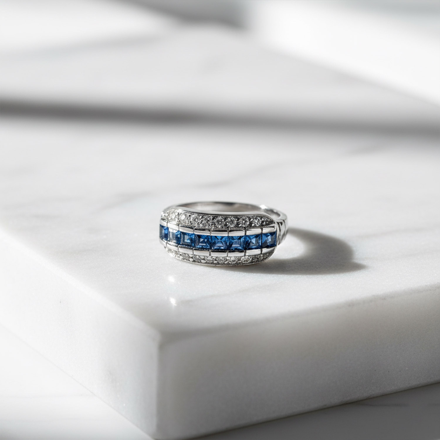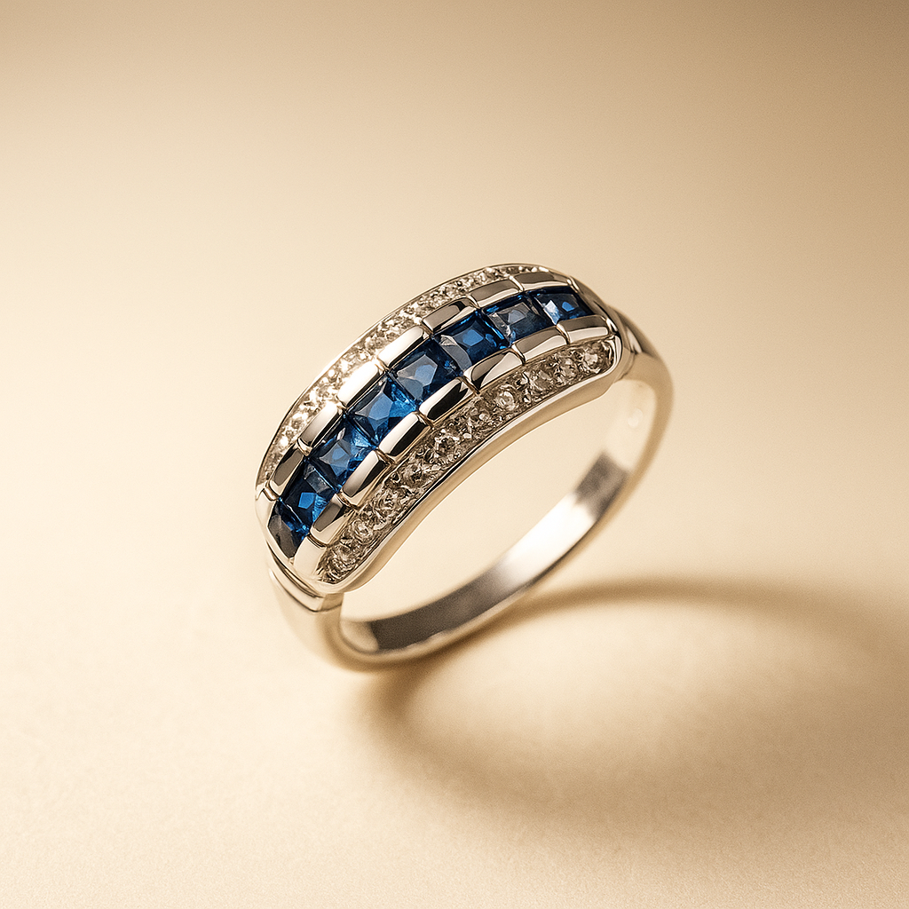 Anillo medio cintillo con zafiros azules naturales corte princess engastados a riel con circonita cubica en pave en plata esterlina 925. Talla 13