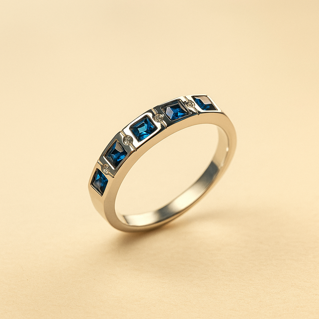 Anillo medio cintillo con cinco zafiros azules corte princesa y  circonita cubica blanca engastados a nivel en plata esterlina  925, Talla 14