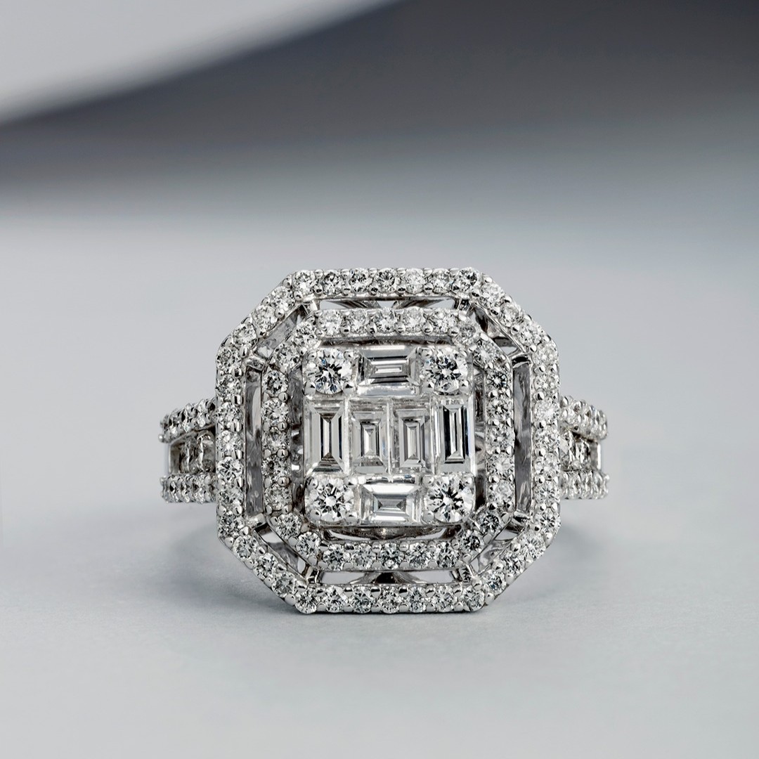 Anillo de Oro Blanco 18k estilo Sophia con un centro de Baguettes y doble Halo de Diamantes corte brillante con un total de 143 puntos en brillantes, es decir 1.43ct Talla 12