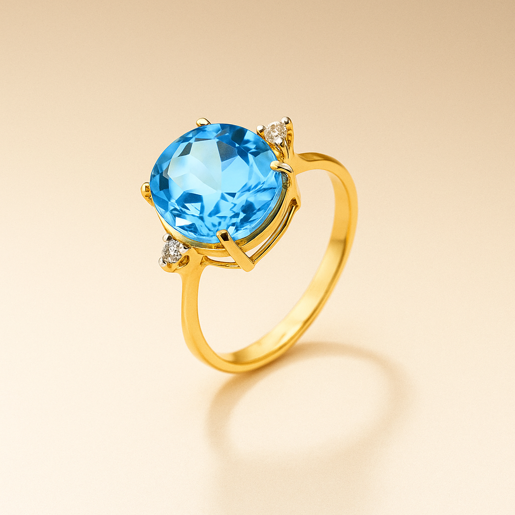 Anillo de Oro Amarillo 18k con un Topacio Azul corte ovalado engastado en grifa de 6.71Cts con 2 diamantes corte brillante a los lados. Talla 12
