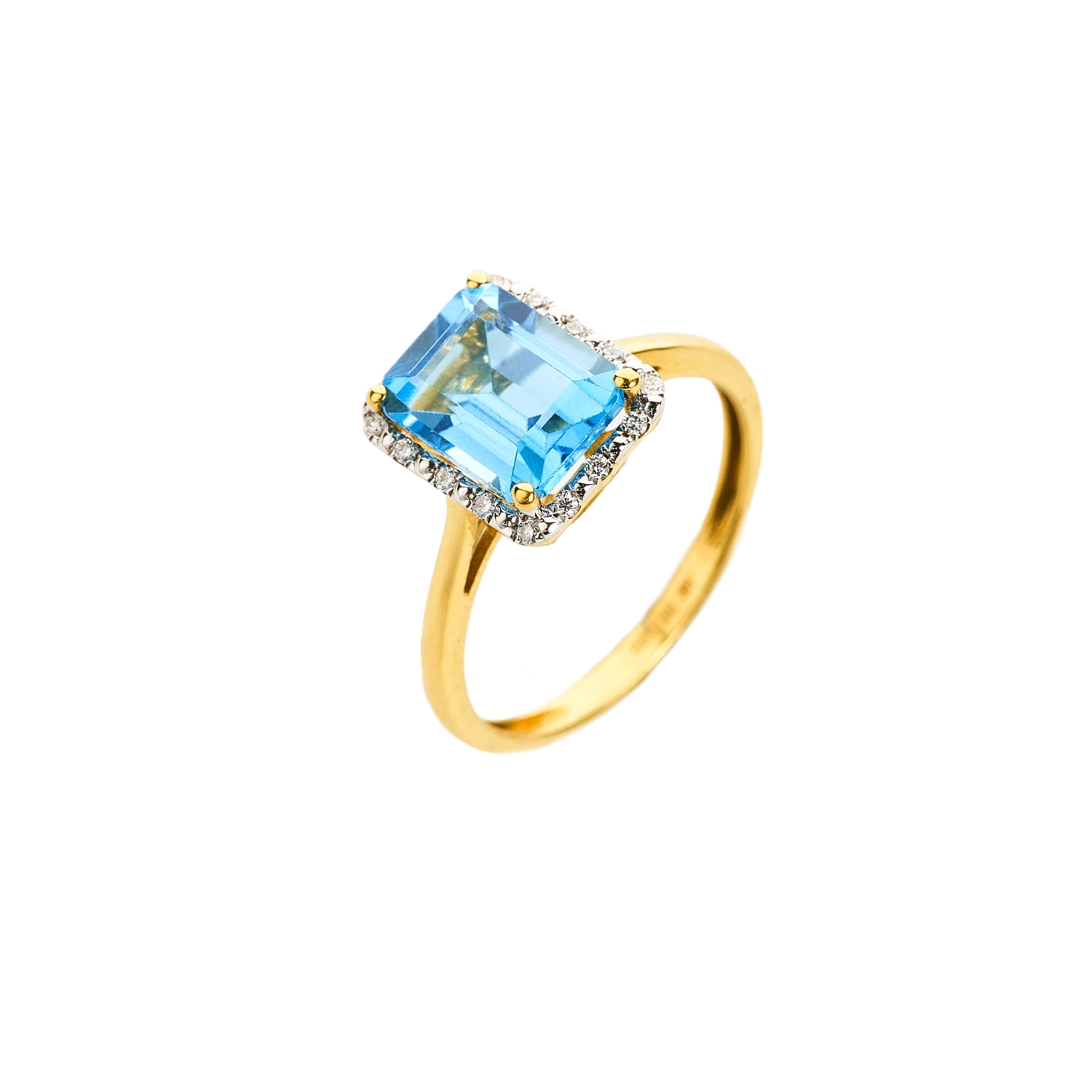 Anillo de Oro Amarillo 18k con un topacio azul central corte esmeralda engastado en grifa con un halo de diamantes corte brillante. Talla 13