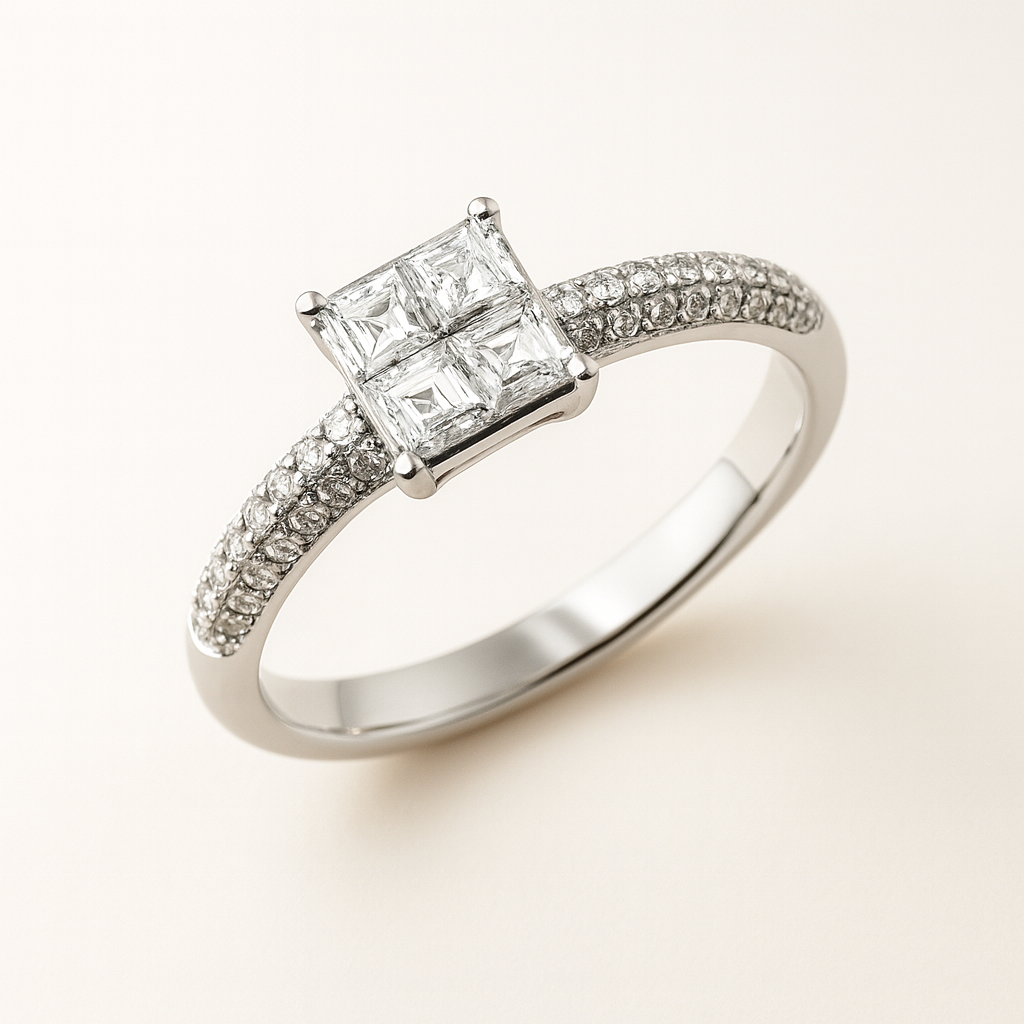 Anillo de Oro Blanco 18k con cuatro diamantes corte princess engastados en grifa y diamantes corte brillante engastados en pave en el cuerpo. 0.39ct en total. Talla 12