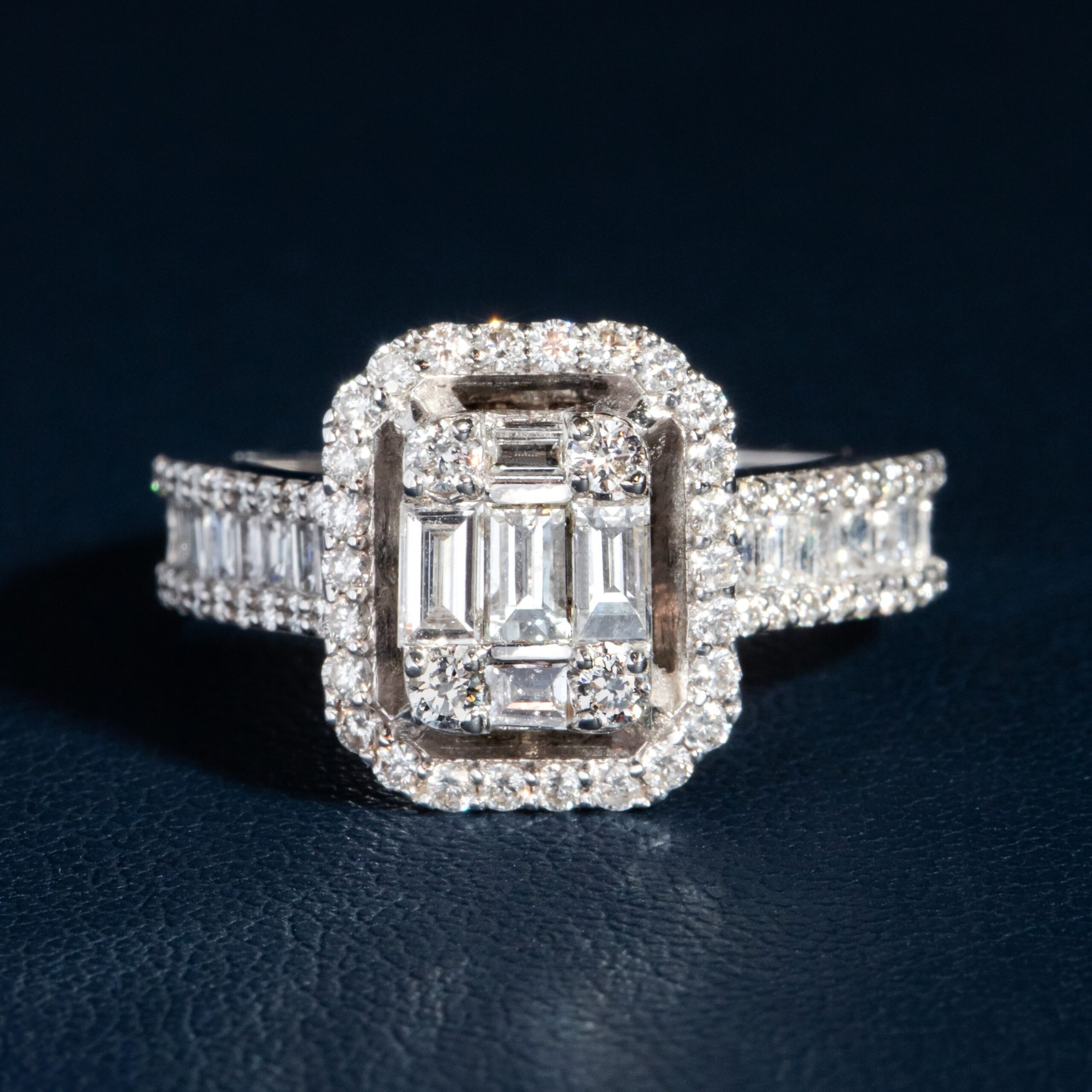 Anillo de Oro Blanco 18k con un centro Sofia en de diamantes en corte Baguette, halo de brillantes y baguette en el cuerpo del anillo. 1.29ct en total. Talla 12.5