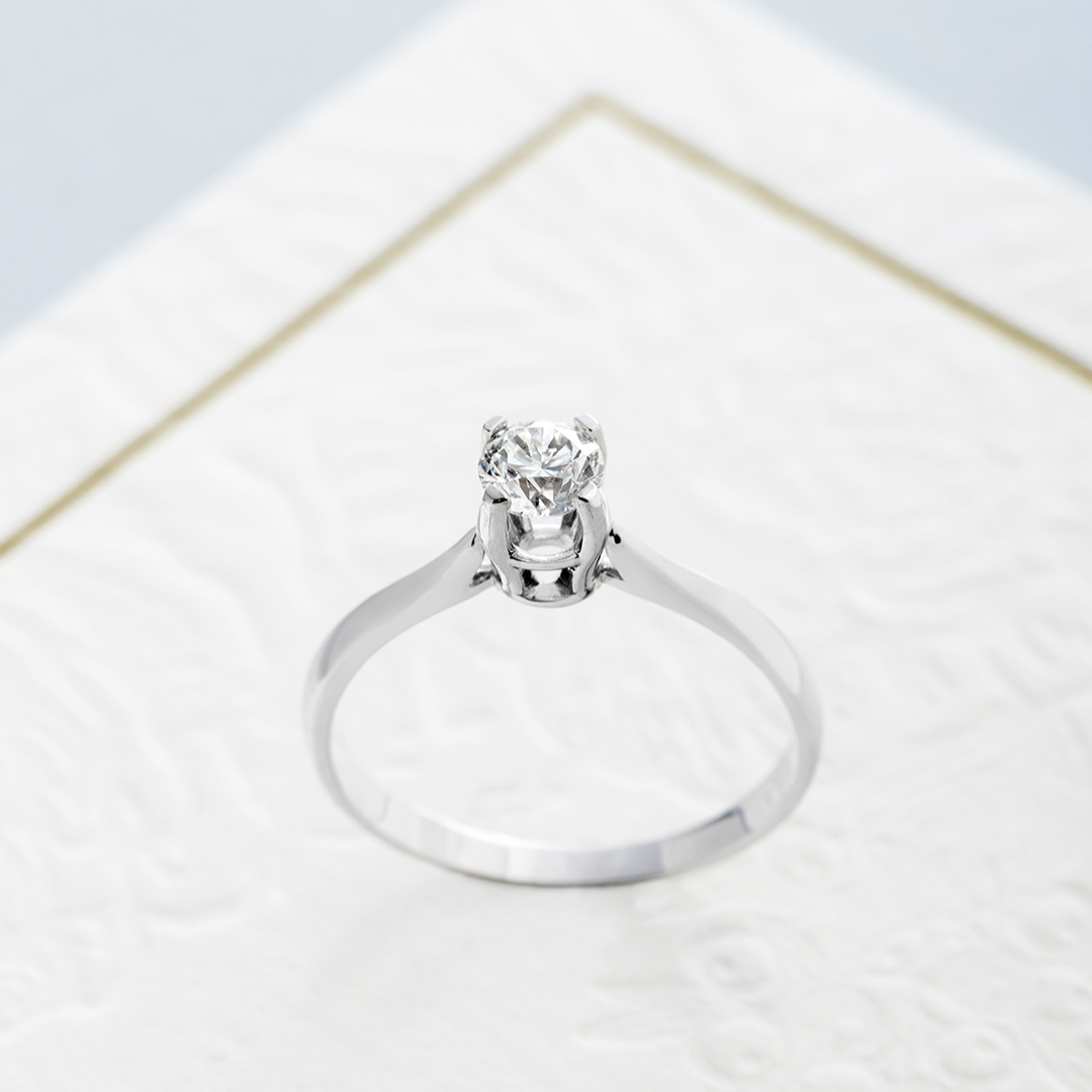 Anillo de Oro Blanco 18k, La Rose,  Estilo Solitario con doble canasto con 4 grifas sosteniendo el diamante corte brillante de 0.50ct. Talla 18