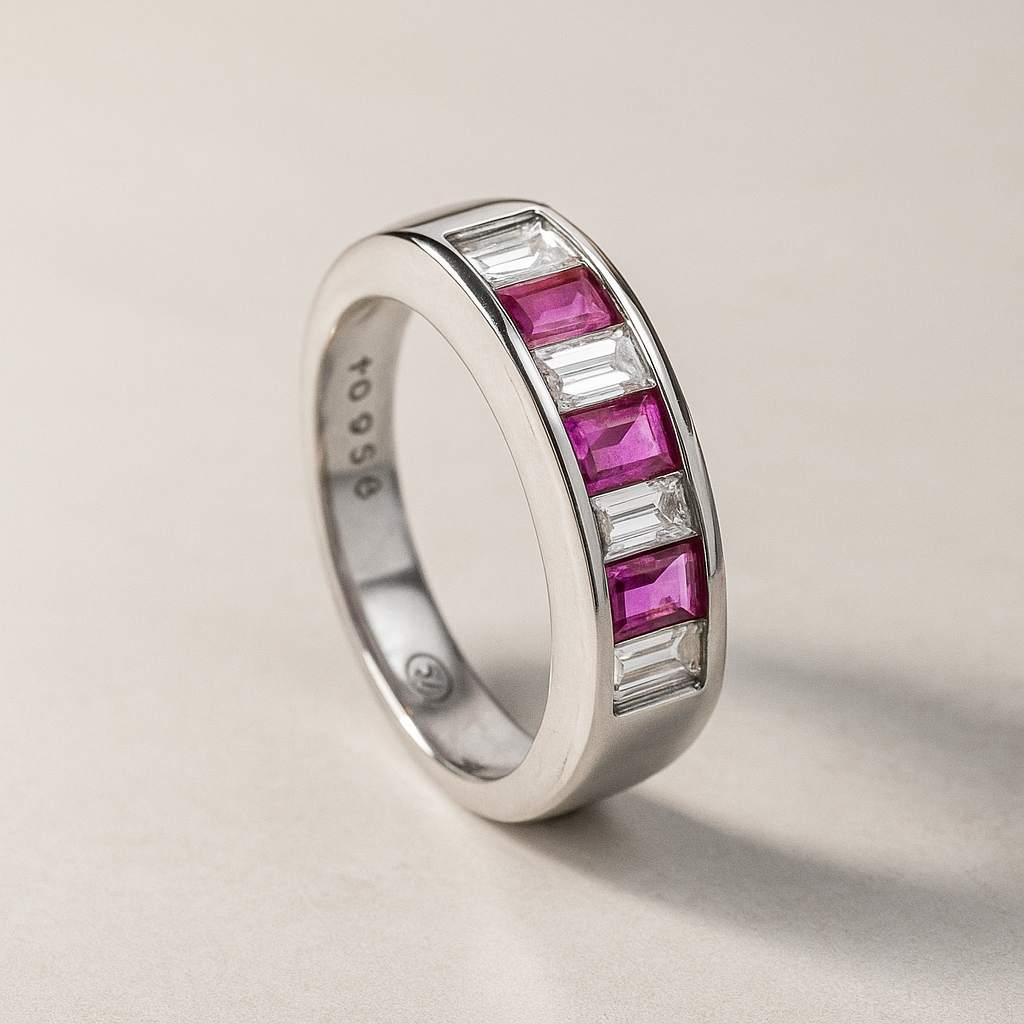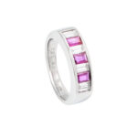 Anillo de Platino con diseño de medio cintillo con diamantes corte Baguette 0.56ct en total y 3 rubies en corte Baguette 0.48ct en total. Talla 10.
