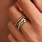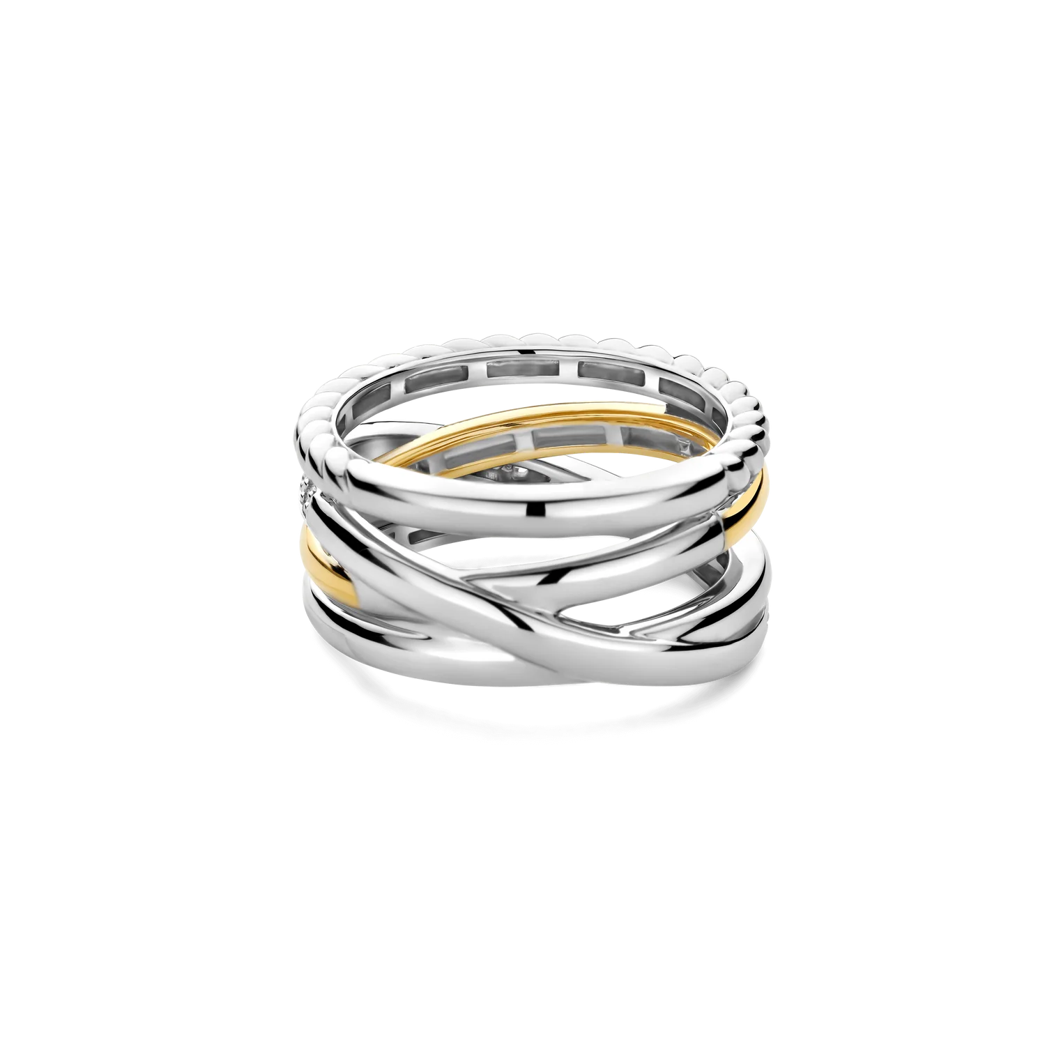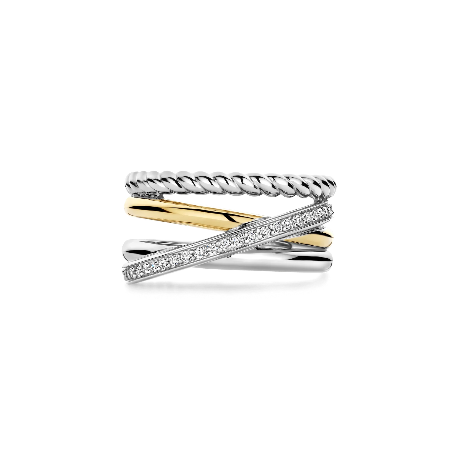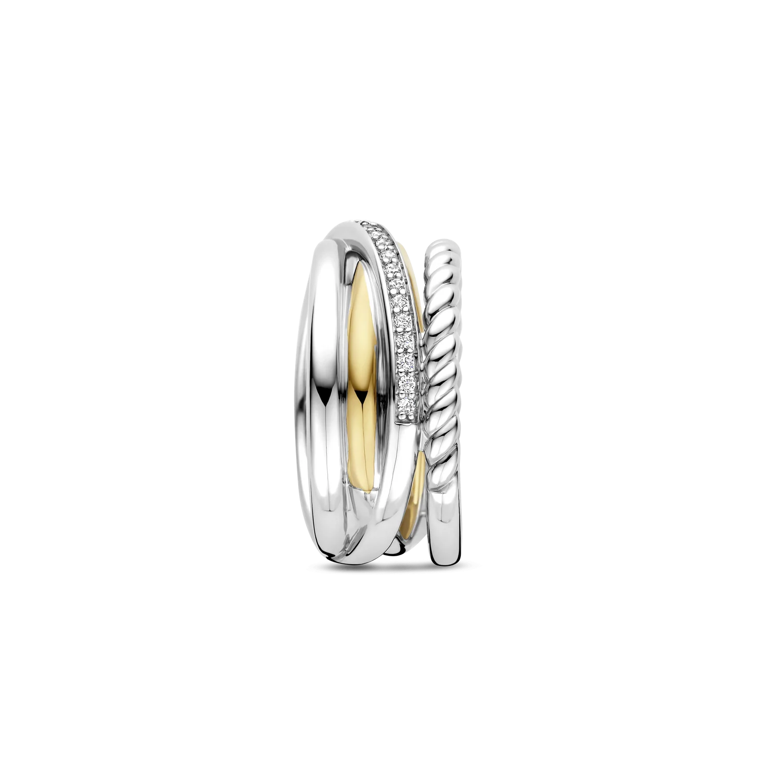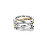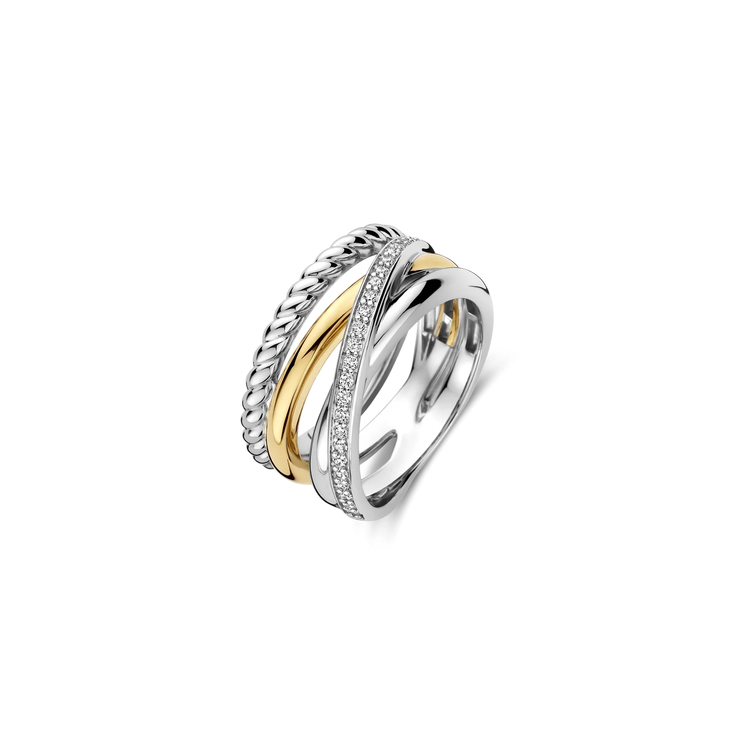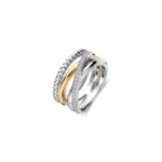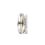 Anillo TI SENTO modelo 12384zy de plata esterlina con recubrimiento de oro amarillo 18k y platino de bandas entrelazadas y circonita blanca. Talla 16.