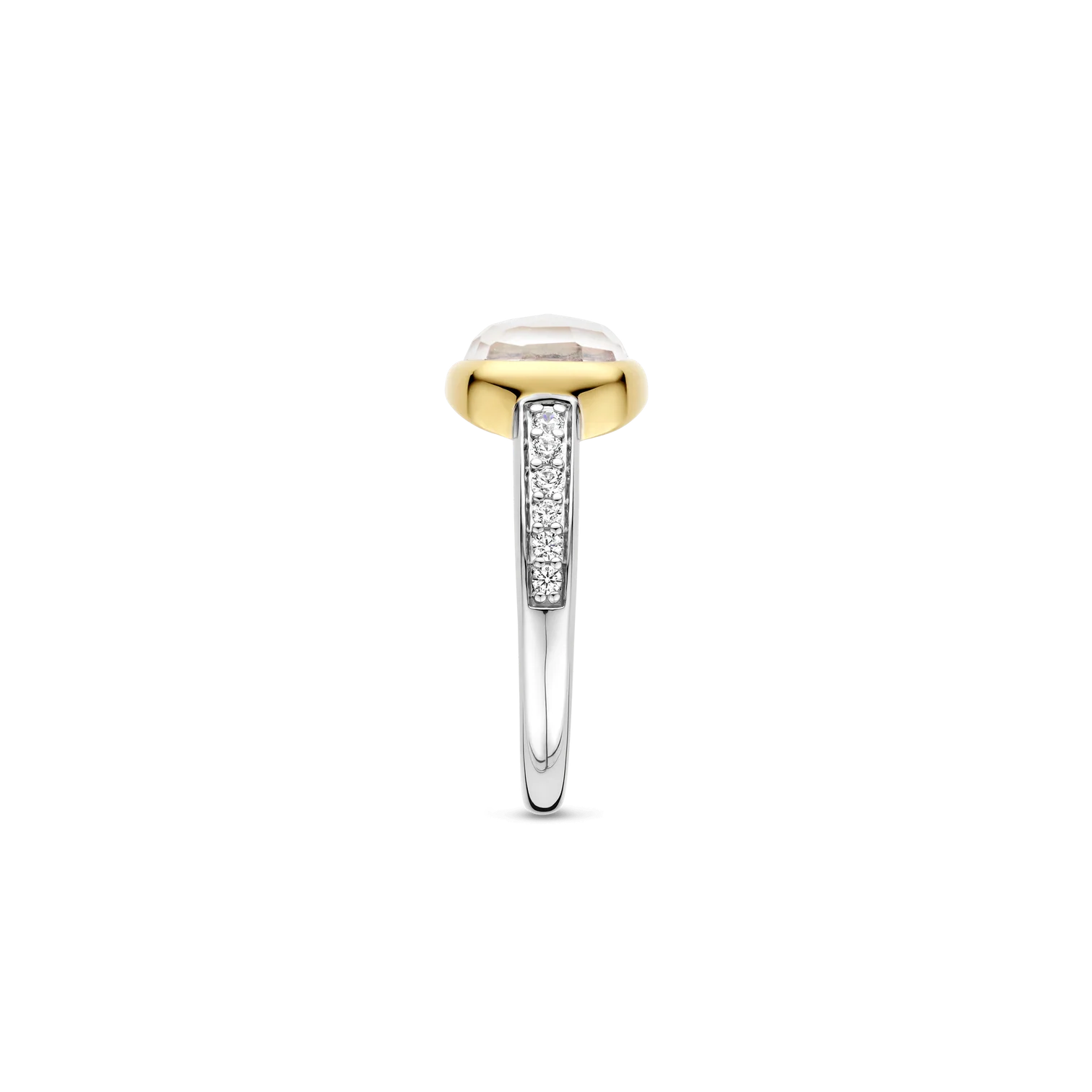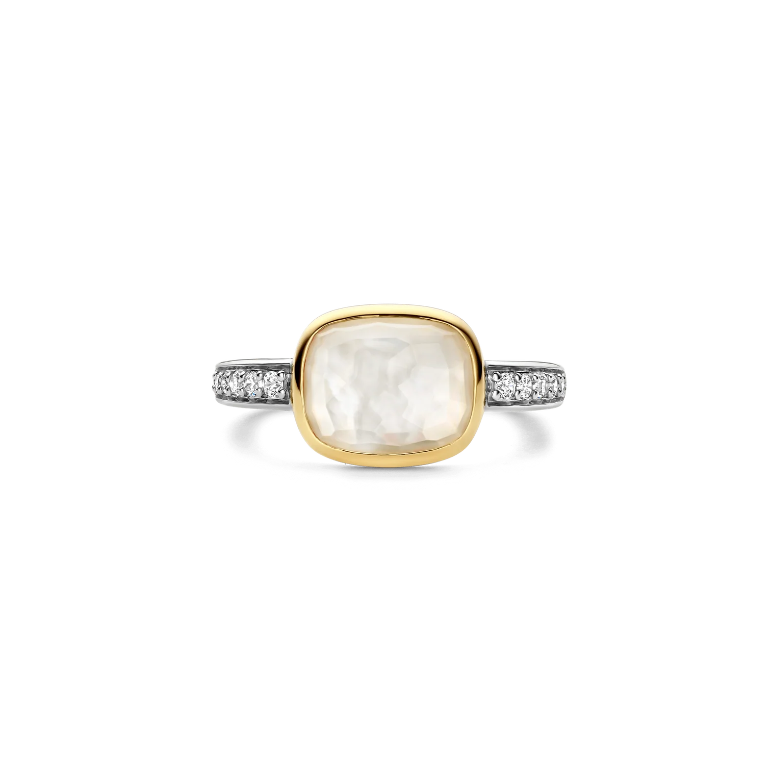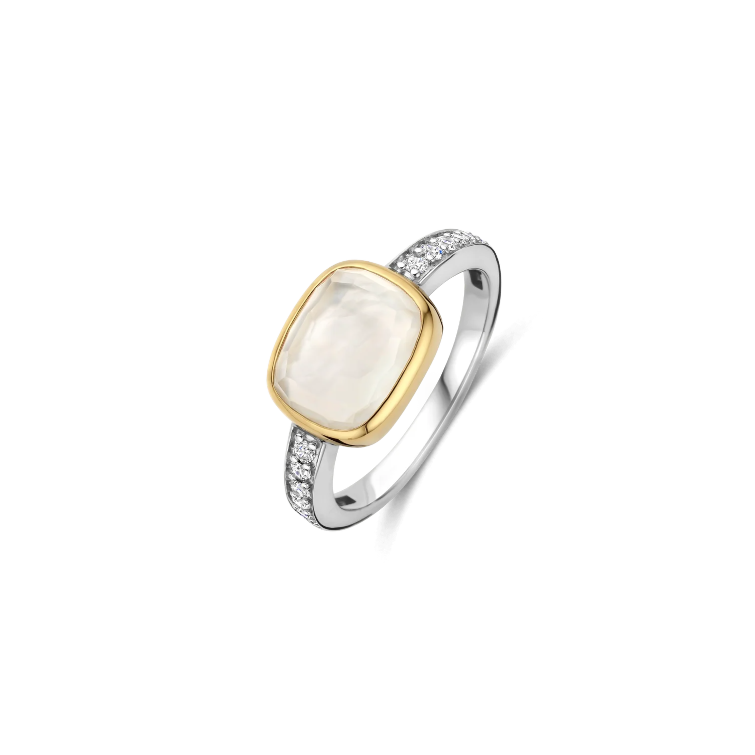 Anillo TI SENTO modelo 12398MW de plata esterlina con recubrimiento en oro amarillo 18k y una piedra central lechosa facetada con circonita blanca. Talla 14.