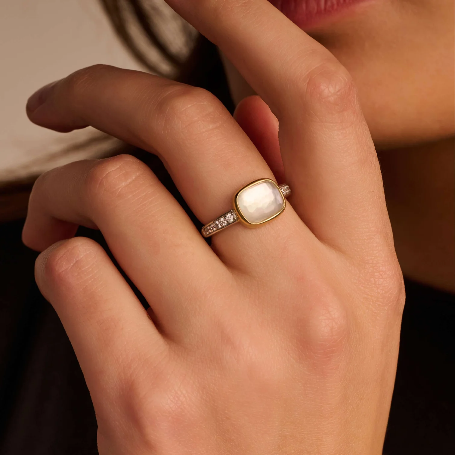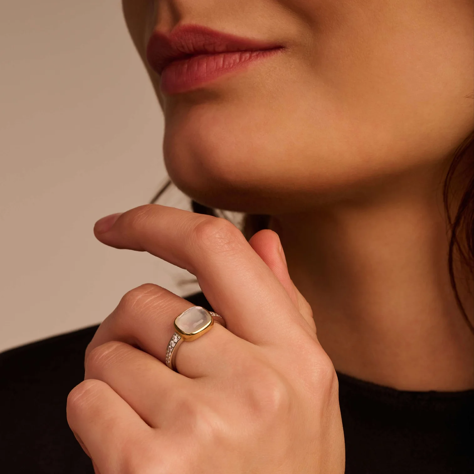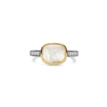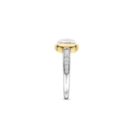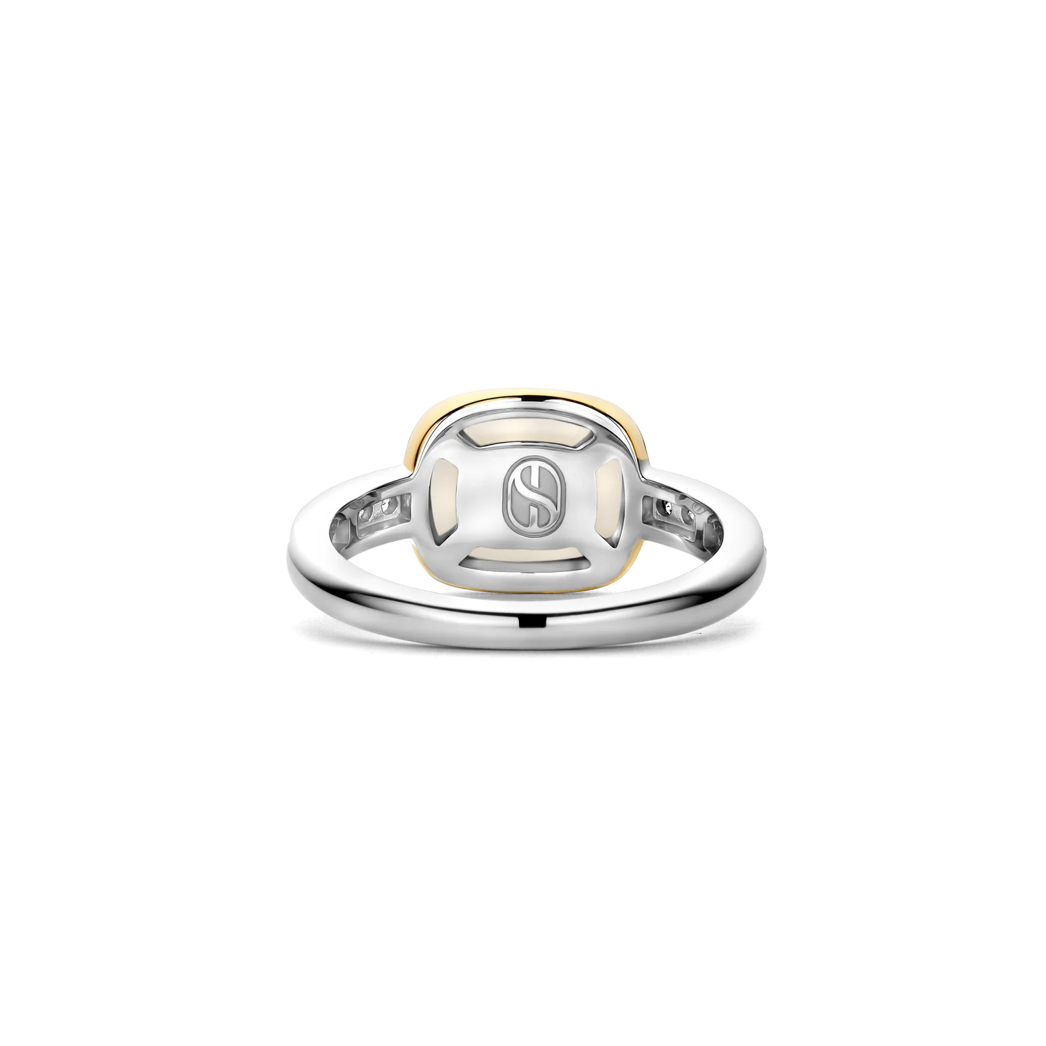 Anillo TI SENTO modelo 12398MW de plata esterlina con recubrimiento en oro amarillo 18k y una piedra central lechosa facetada con circonita blanca. Talla 14.