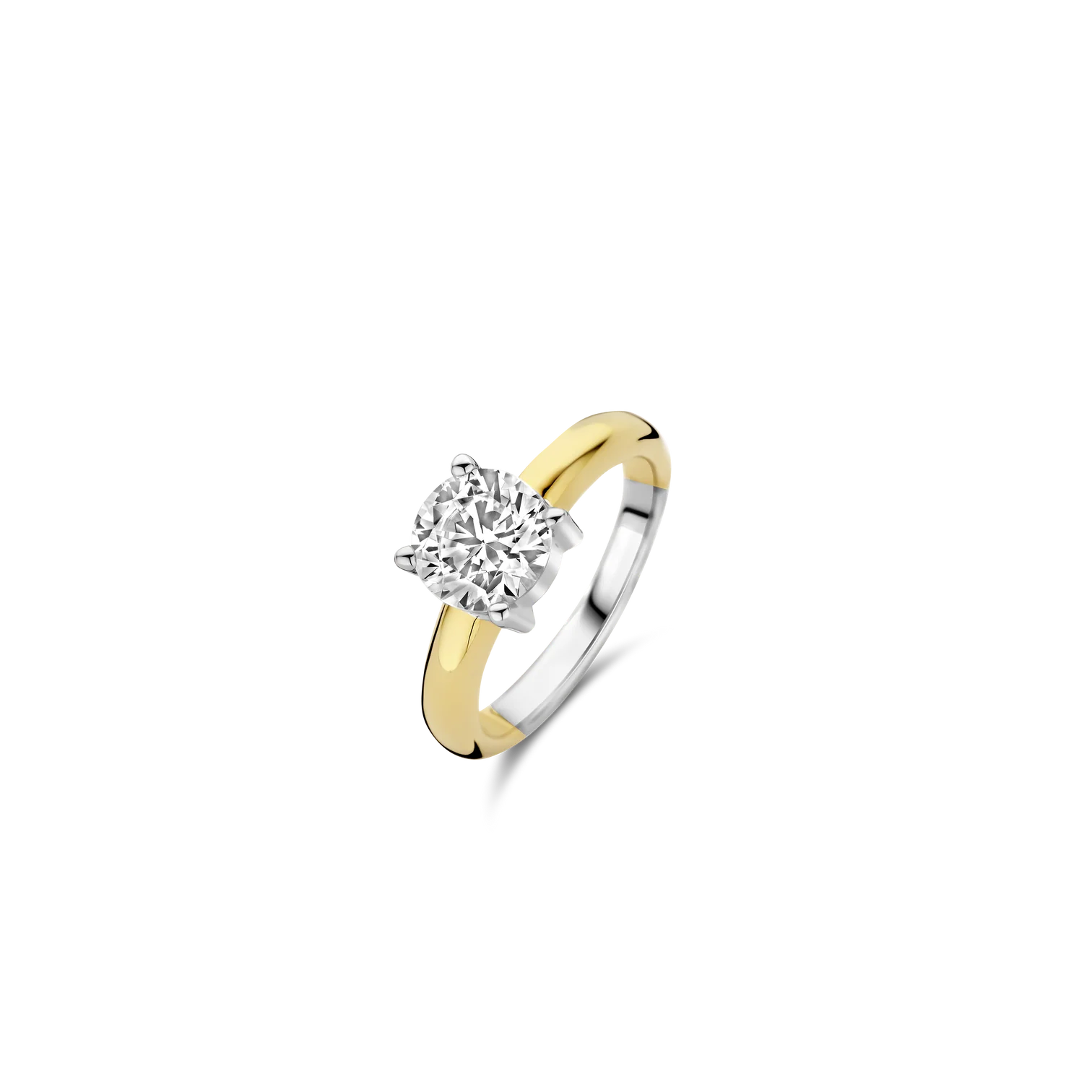 Anillo TI SENTO modelo 14654zy de plata esterlina con recubrimiento en oro amarillo 18k estilo solitario con circonita cubica blanca engastada en grifa. Talla 12