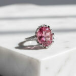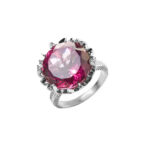 Anillo topacio rosado natural en corte redondo engastado en grifas de plata con diseños de hojas estilo rosa de plat esterlina 925. Talla 14