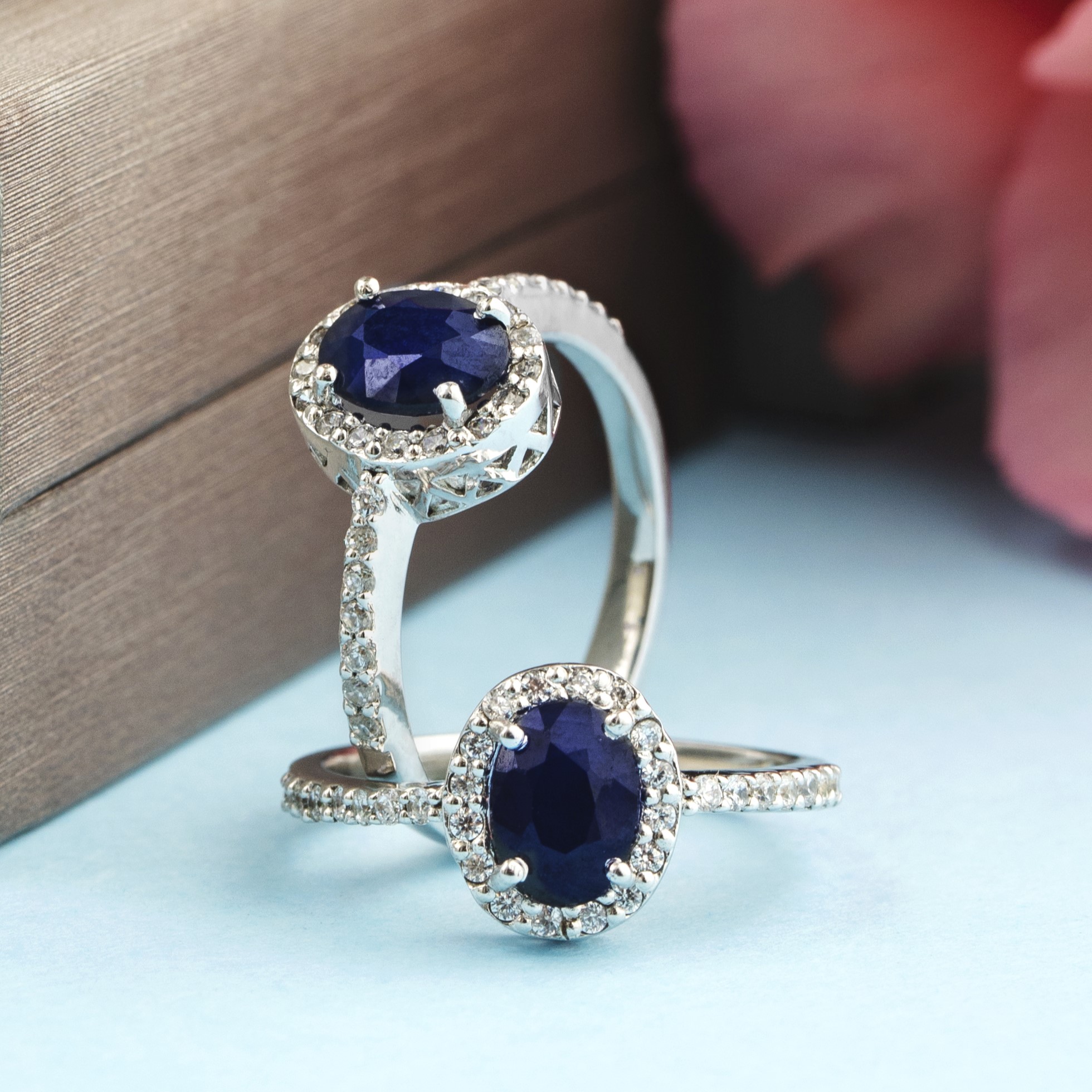 Anillo de la colección Bloom by Mery-Satt en plata 925 con zafiro azul natural de 2,33CT, rodeado de circonita suiza y circones pavé en el cuerpo. Talla 12.
