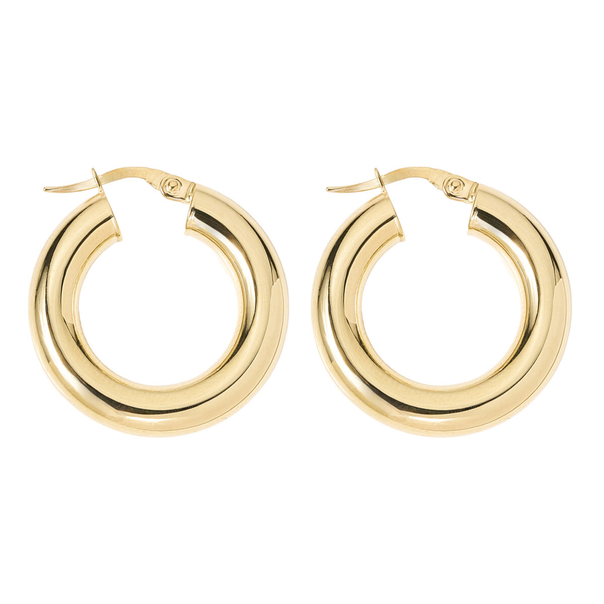 Aros de oro amarillo 18k con diseño de argolla estilo tubo lisas con un diámetro de 15 milimetros con cierre Italiano.