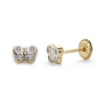 Aros de la nueva colección para niñitas, diseñada por Mery-Satt en bicolor, con oro amarillo y blanco de 18 kilates, en forma de mariposa con delicados circones y tuerca de seguridad tipo rosca. Tamaño: 6 x 4 milímetros. Consulte por otros modelos para recién nacida o niñita.