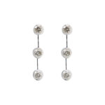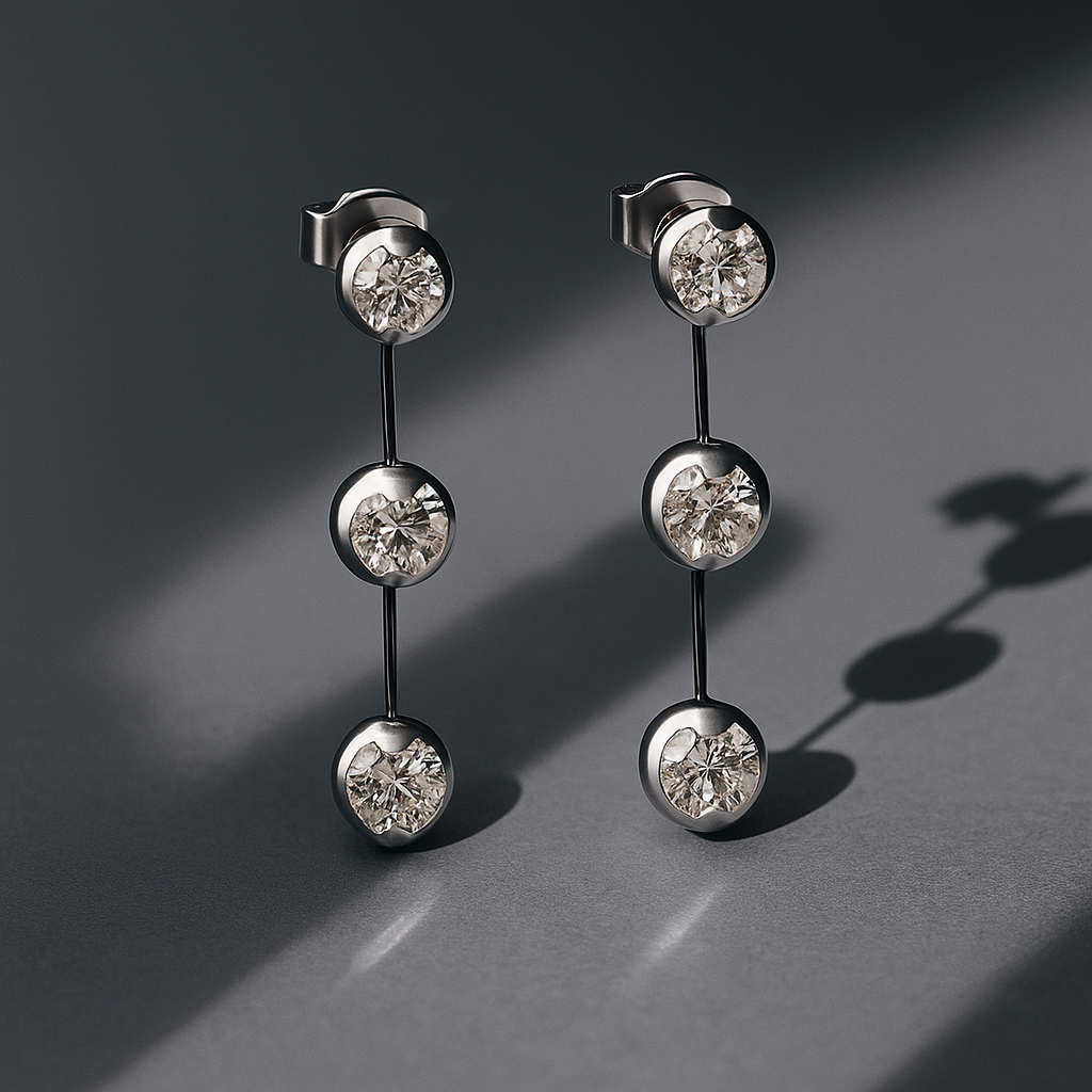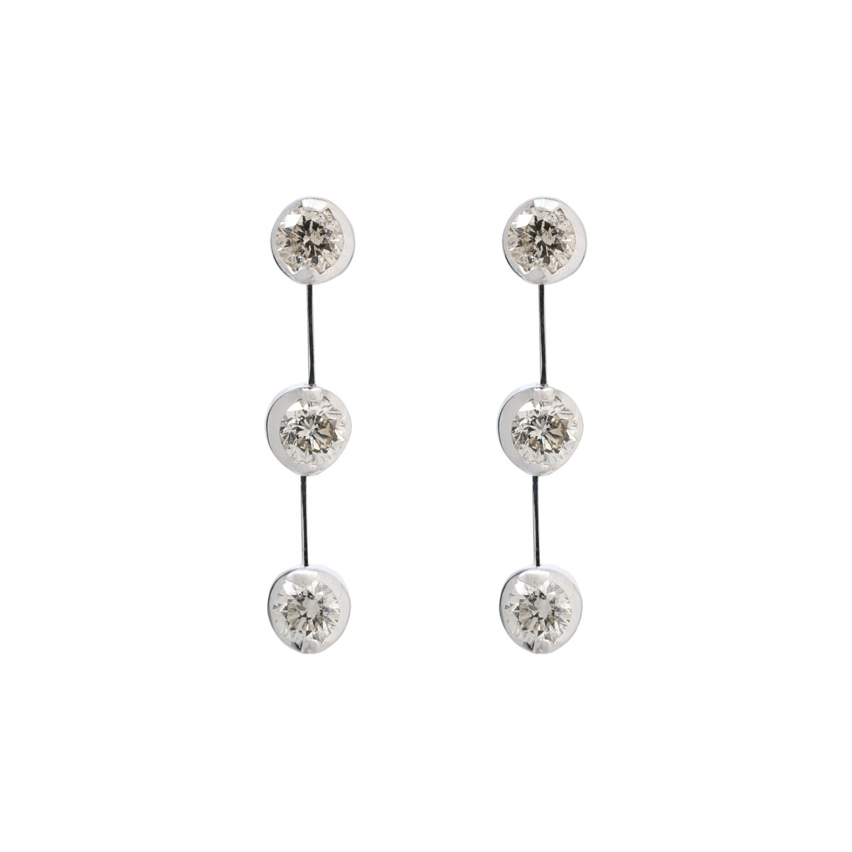Aros de oro blanco 18k barra con 3 diamantes corte brillante de 0.70ct en total engastados en grifa y canasto degaldo, largo 20mm
