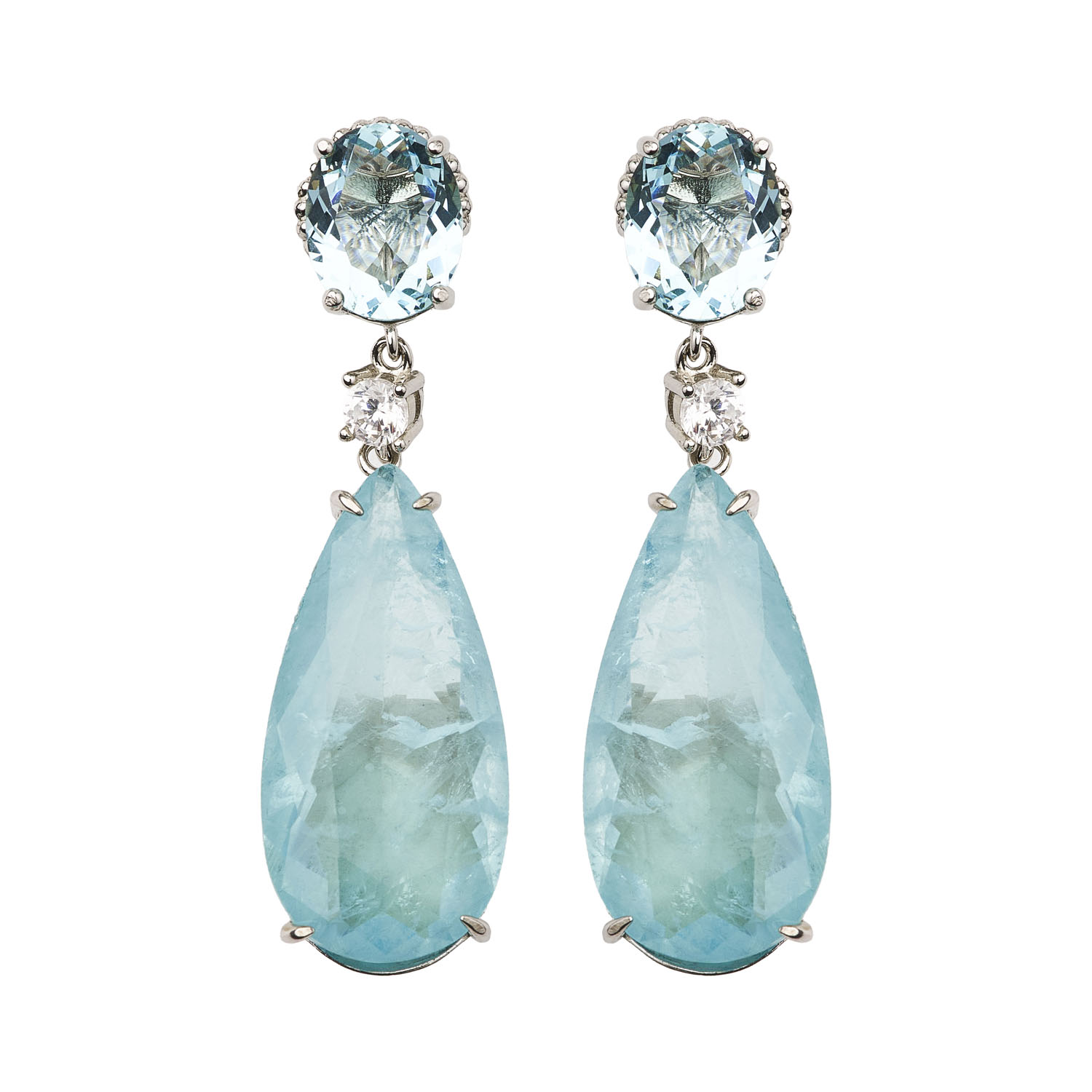 Aros de plata esterlina 925  Largos, con aguamarina reconstituida corte redondo engastada en grifa con una aguamarina en forma de gota colgando. Largo 35mm. Cierre a presión.