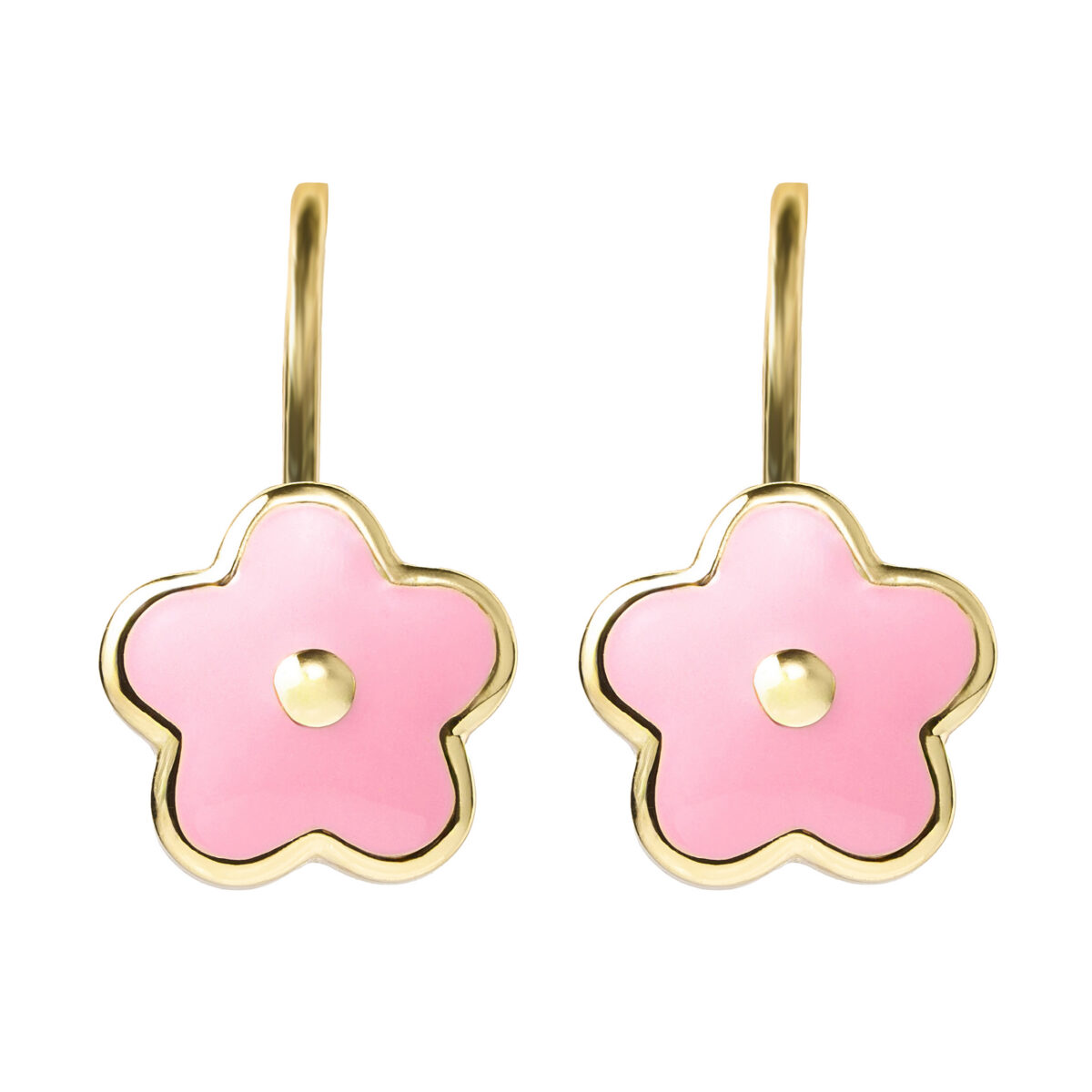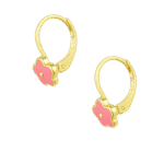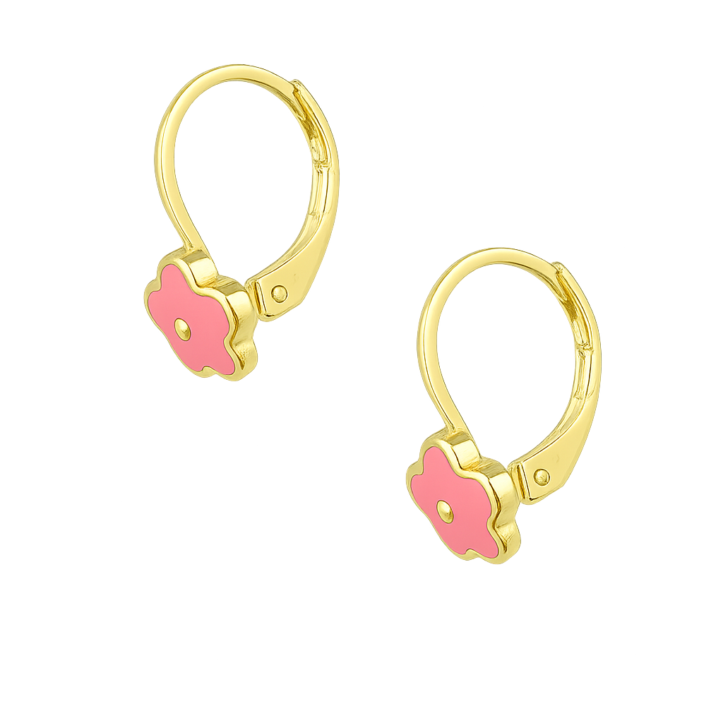 Aros de plata esterlina con recubrimiento de oro amarillo 18k con diseño de argolla mini con una flor con esmalte italiano rosa.