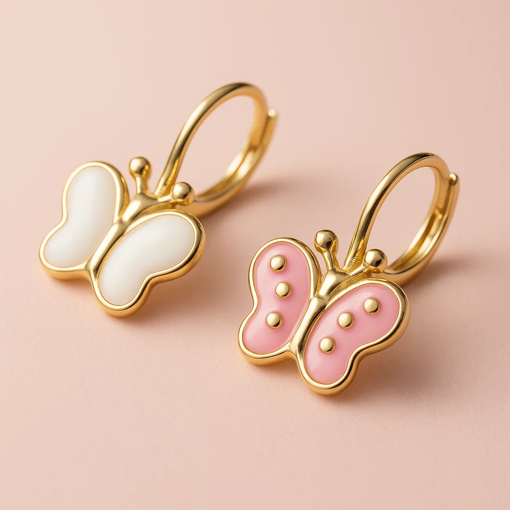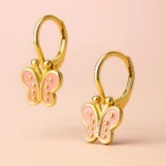 Aros de plata esterlina con recubrimiento de oro amarillo 18k con diseño de argolla mini con una mariposa con esmalte italiano rosa.