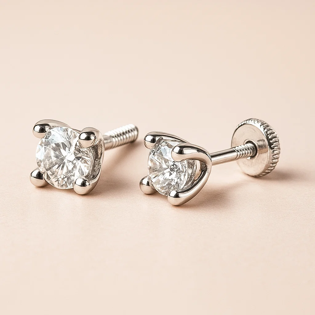 Aros de  oro Blanco 18k con diseño de solitario de diamante corte Brillante de 0.08ct engastado en grifa, con vástago y tope atornillado.