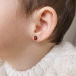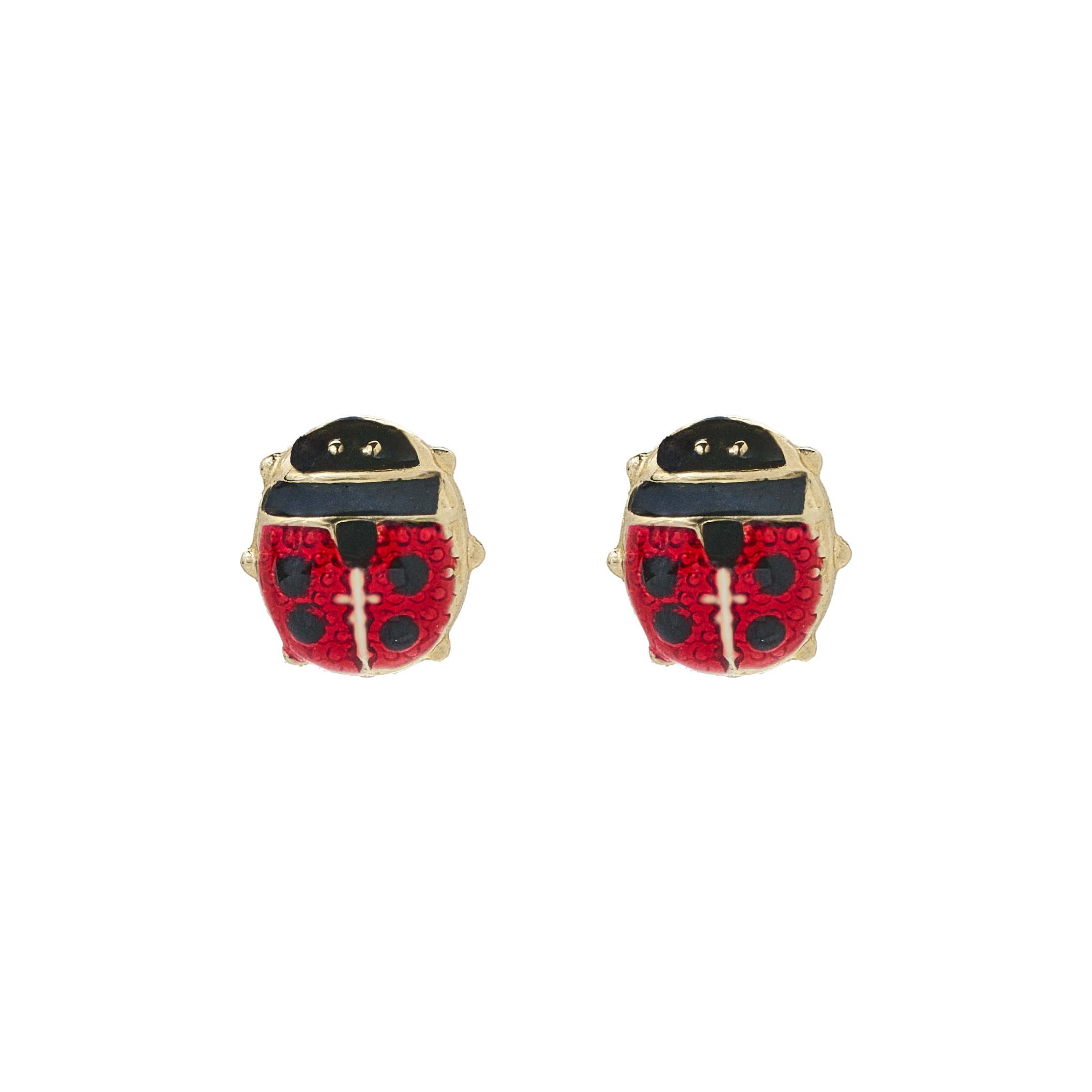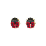 Aros de Oro amarillo 18k con diseño de chinita con esmalte italiano en tono negro y rojo, medidas son 6x5mm. Cierre de tornillo para más seguridad.