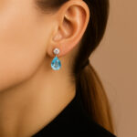 Aros de plata esterlina con recubrimiento en oro amarillo 18k con circonita cubica corte redondo y un topacio azul reconstituido en forma de gota afacetada. cierre a presión. 18mm de largos