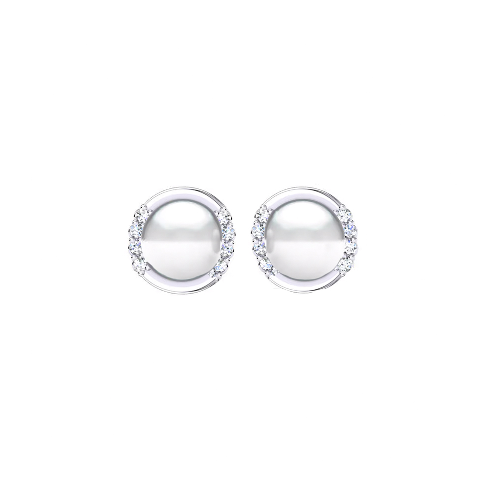 Aros de Oro Blanco 18k con perla central de 6mm engastada con un bisel de oro blanco y diamantes corte brillante engastados en pave a los lados de la perla.