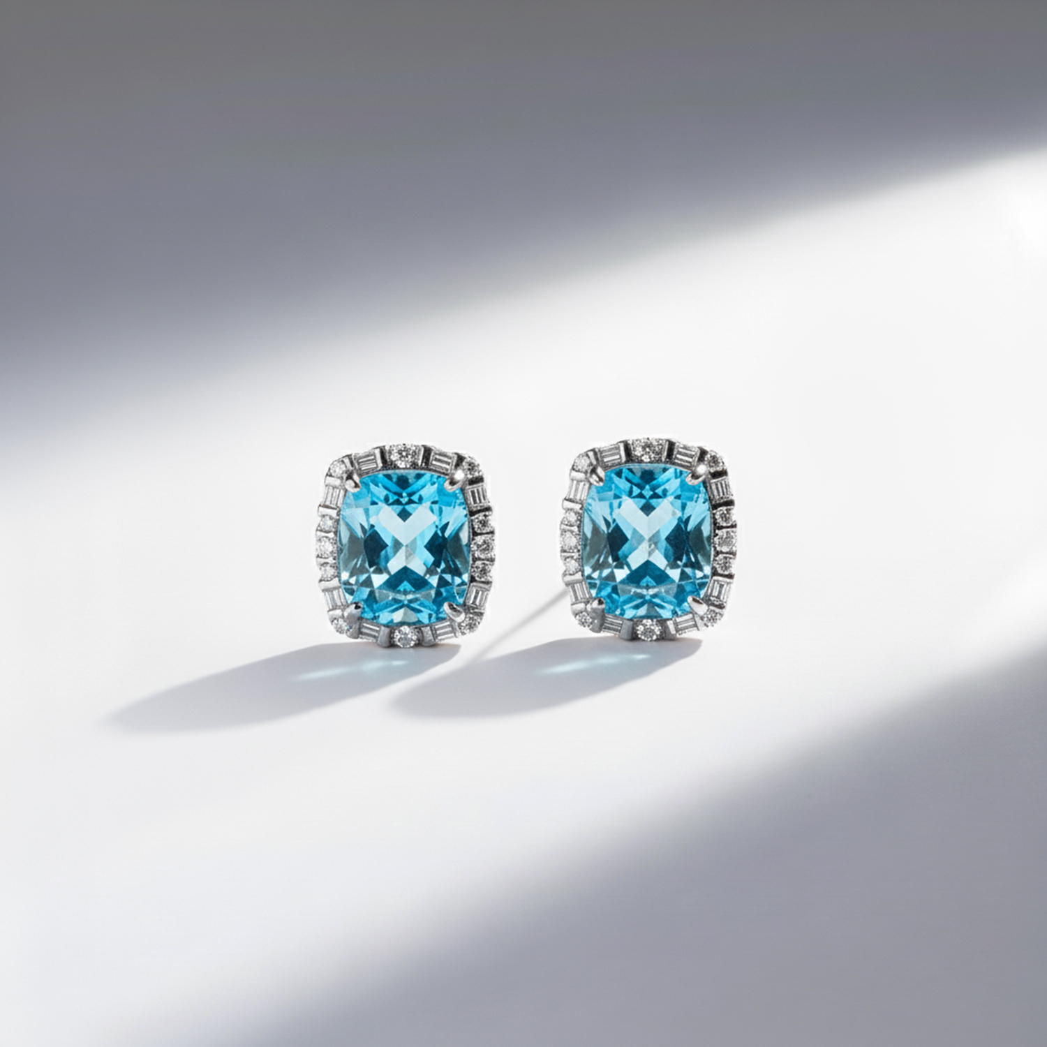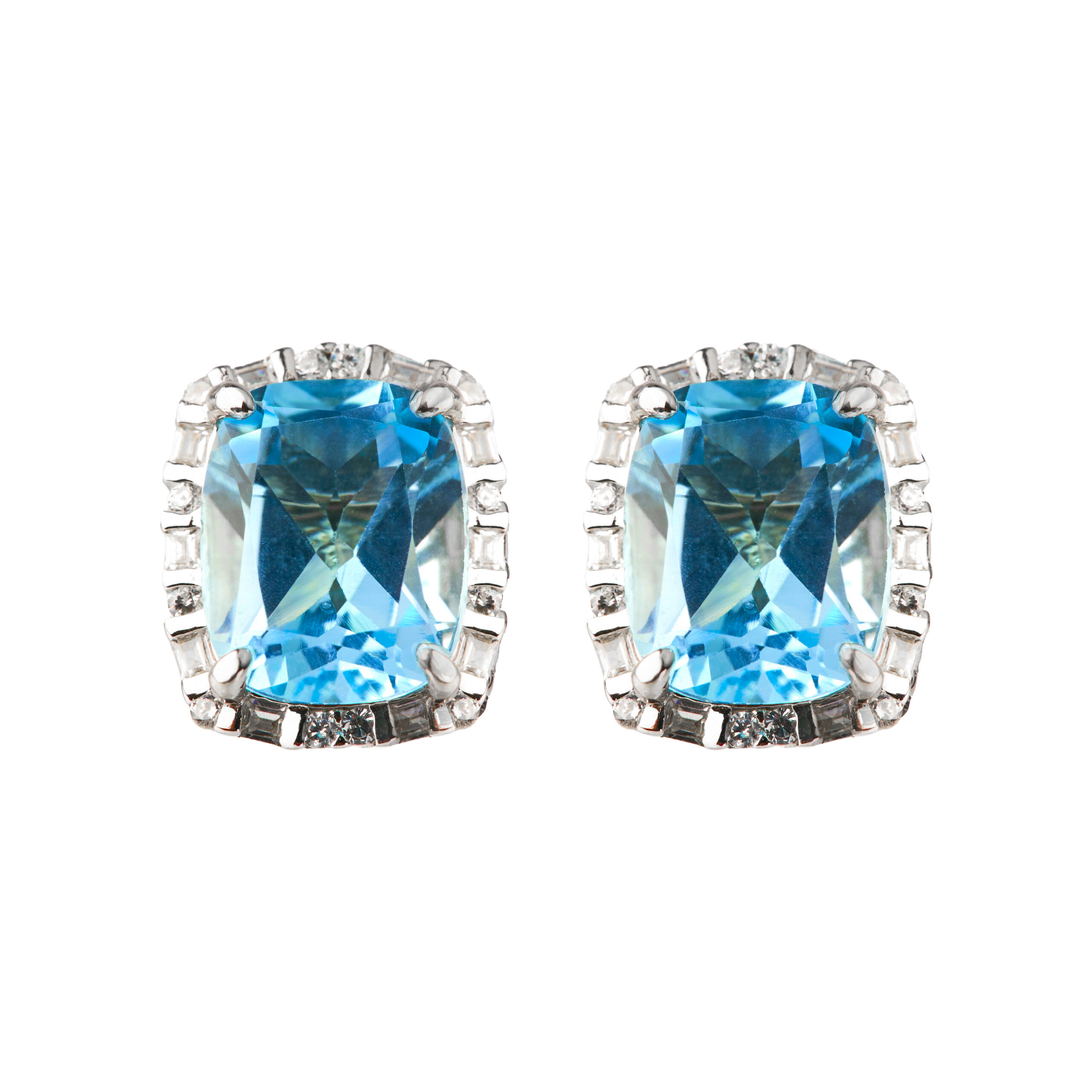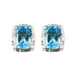 Aros de topacio azul naturales facetados engastados en grifa con un halo de circonitas cubicas corte redondo y baguette. Cierre a presión. Medidas. 1cm x 1,2cm