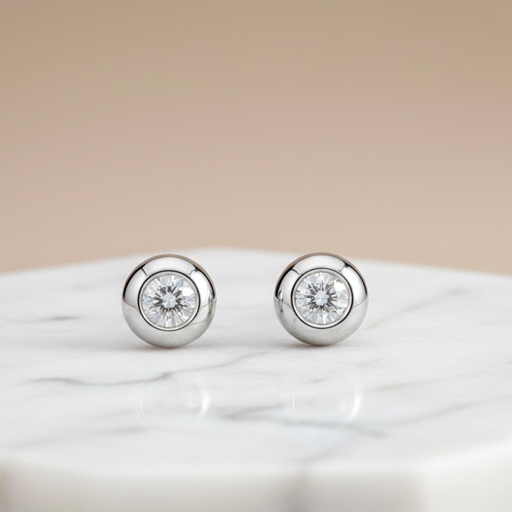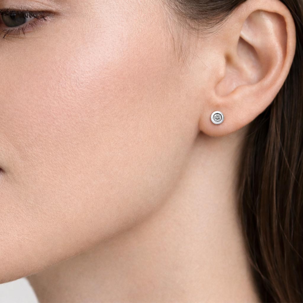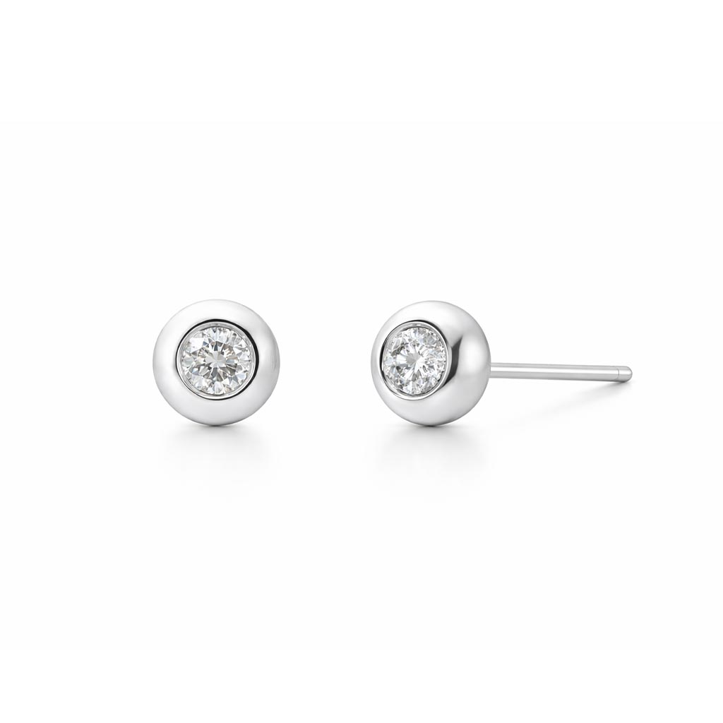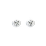 Aros de oro blanco 18k con un diamante central corte brillante engastado en bisel redondeado con vastago liso y cierre a presión. 0.13ct en total.