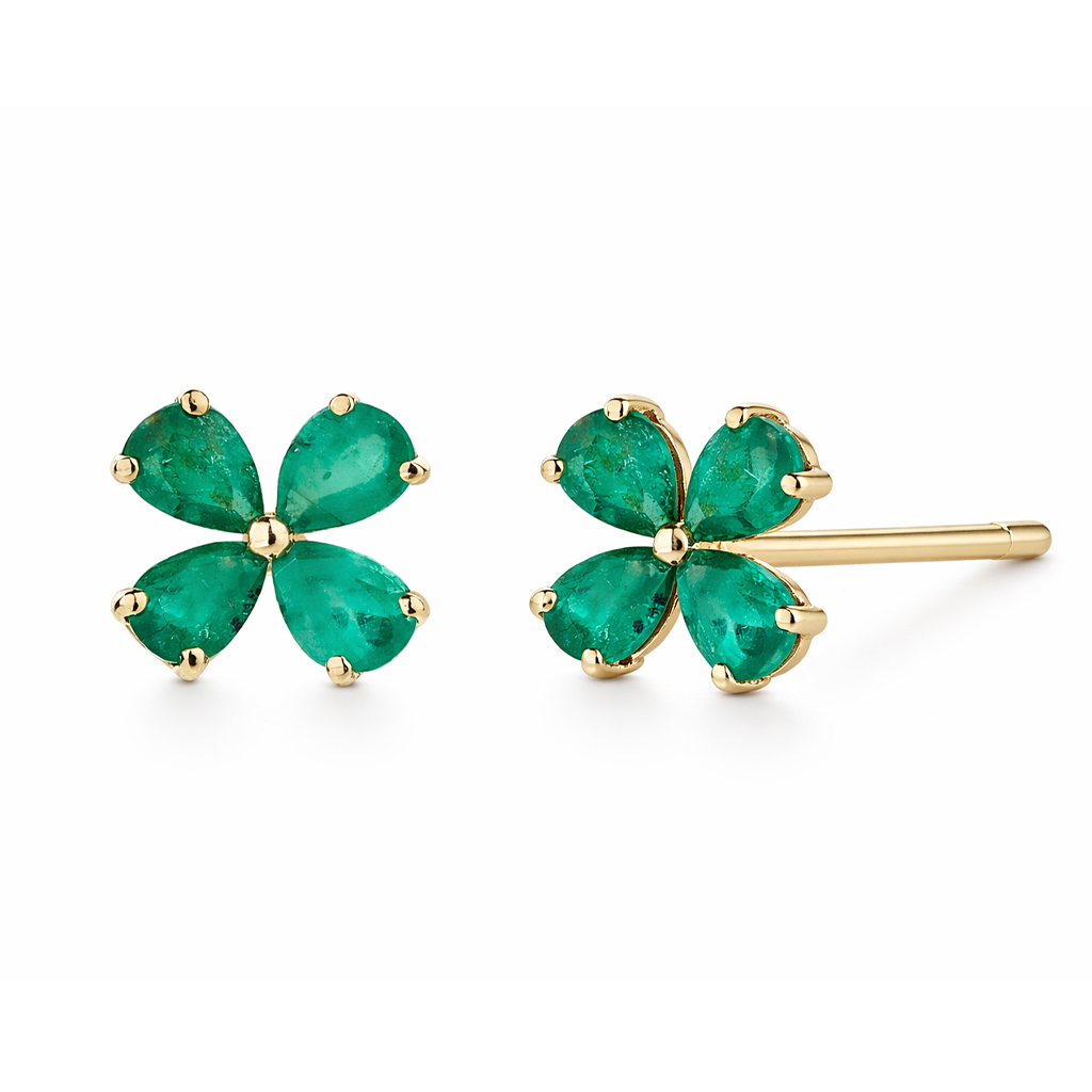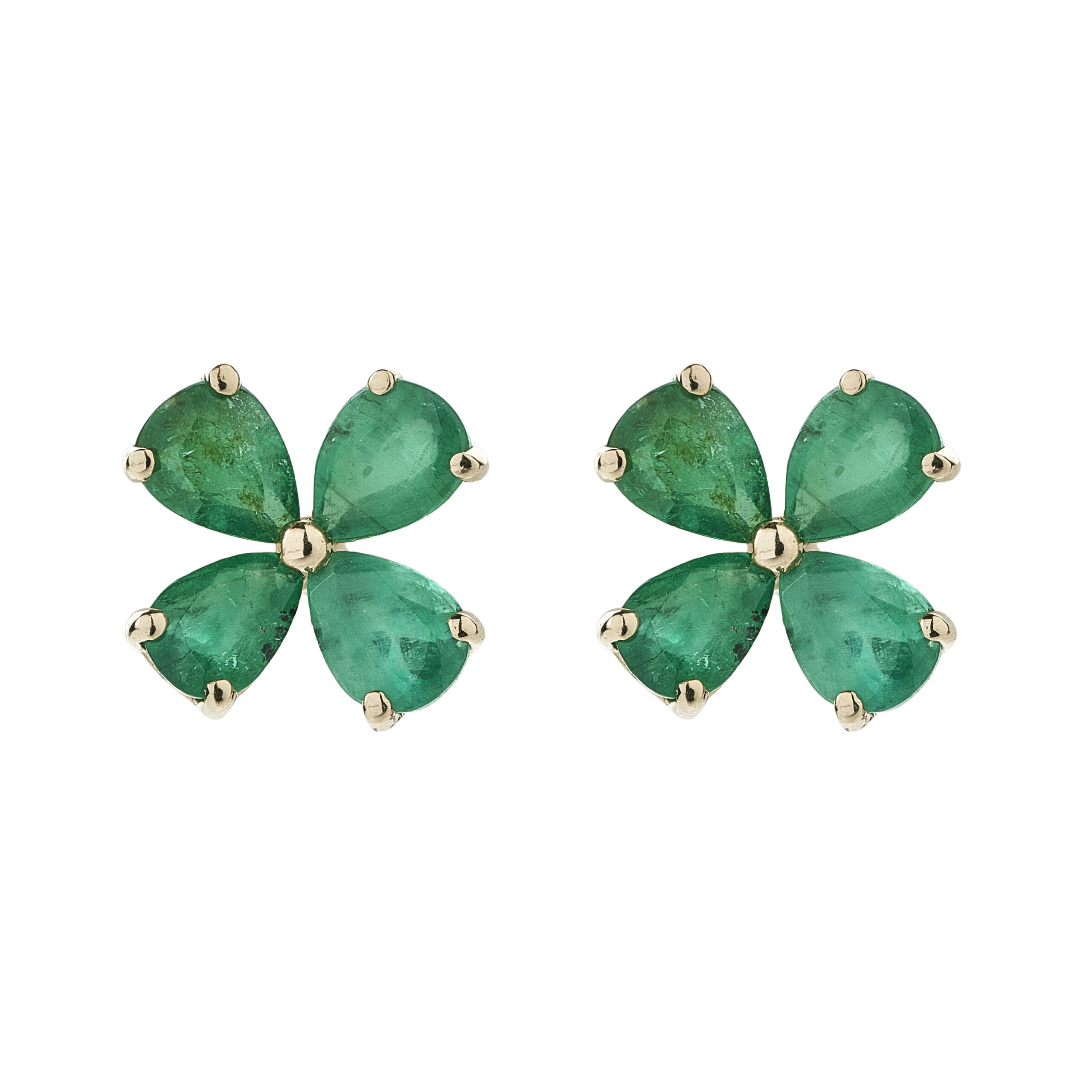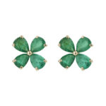 Aros de Oro Amarillo 28k con Esmeraldas en corte pera o gota engastadas en grifas en forma de flor de cuatro pétalos 0.96ct en total.