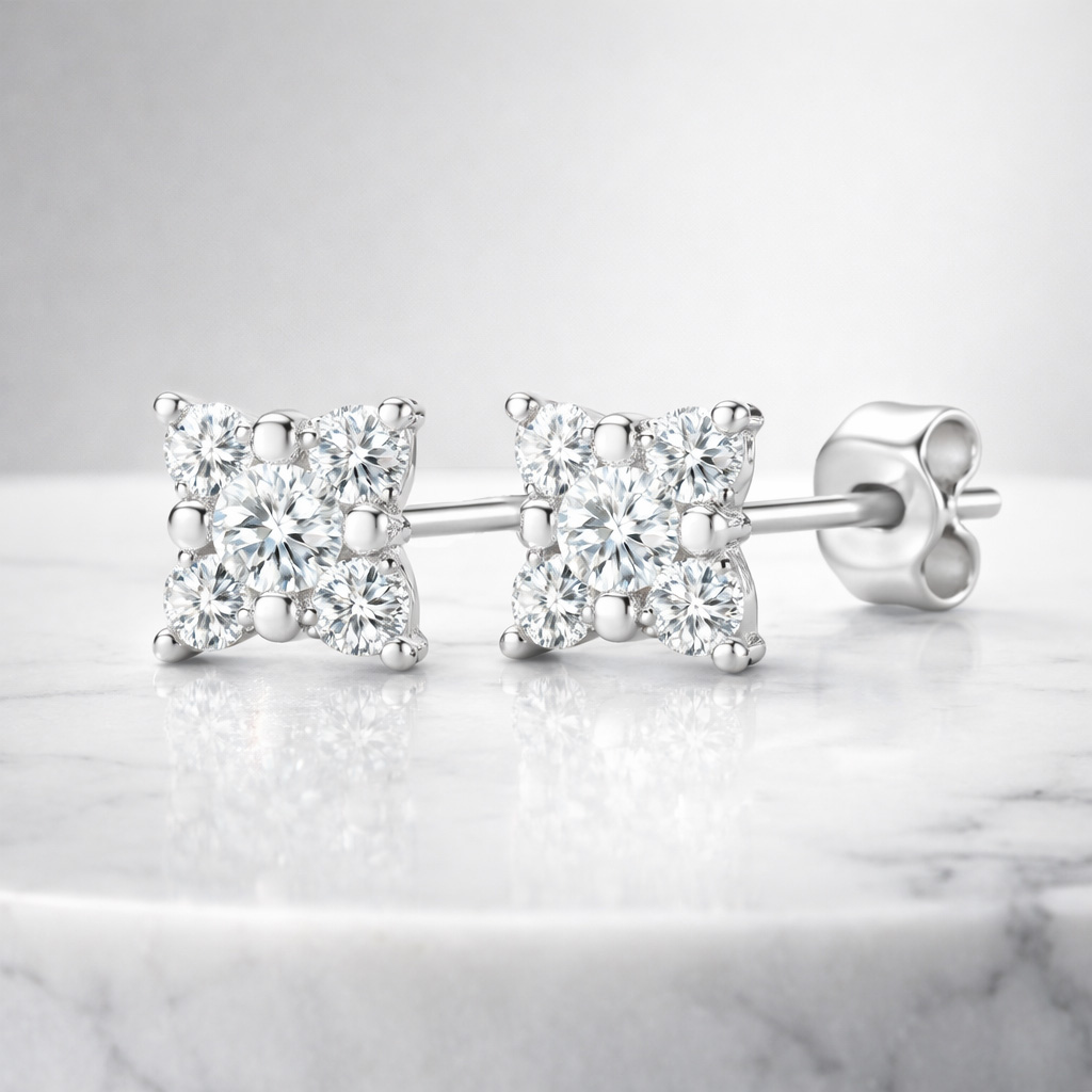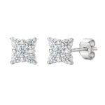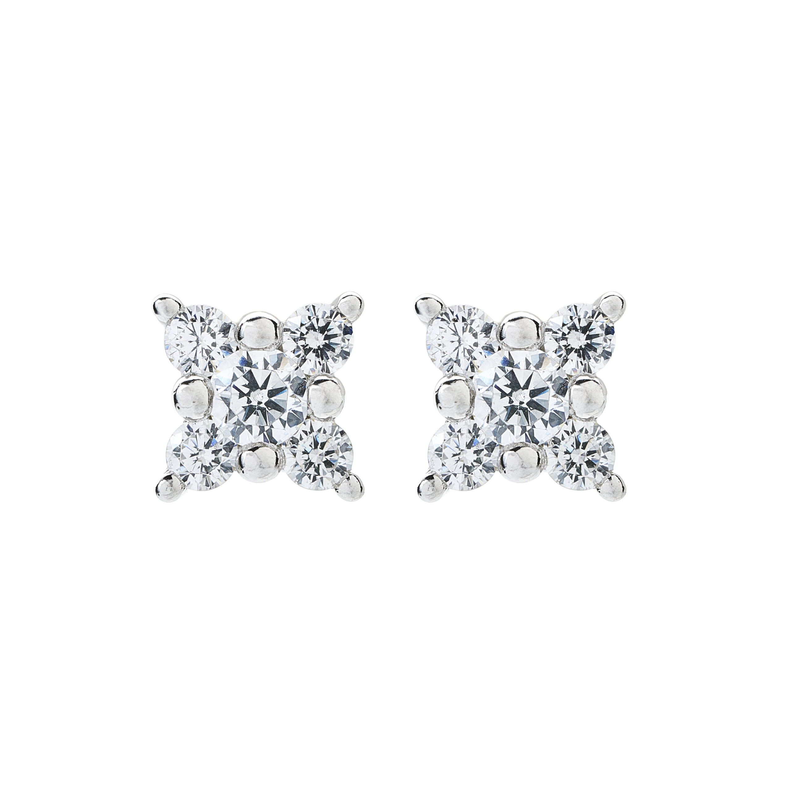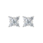 Aros de Oro Blanco 18k con diamantes corte redondos engastados en grifas con diseño de flor con cuatro pétalos en total o.46ct