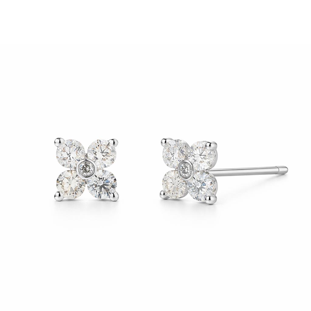 Aros de Oro Blanco 18k con diseño de flor con 4 diamantes corte brillante engastados en grifa y un diamante central en bisel. Cierre a presión.