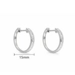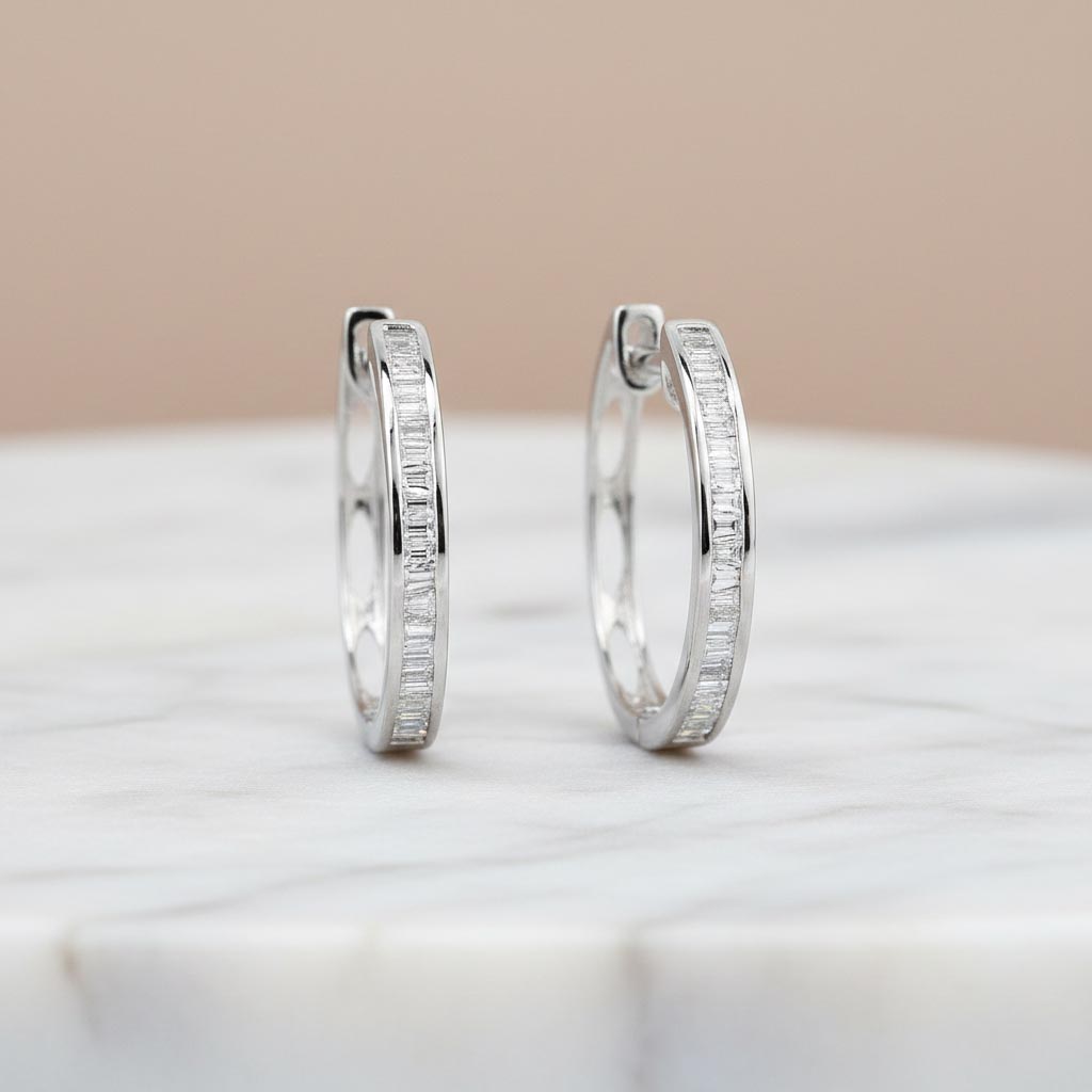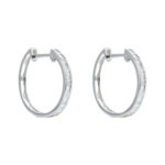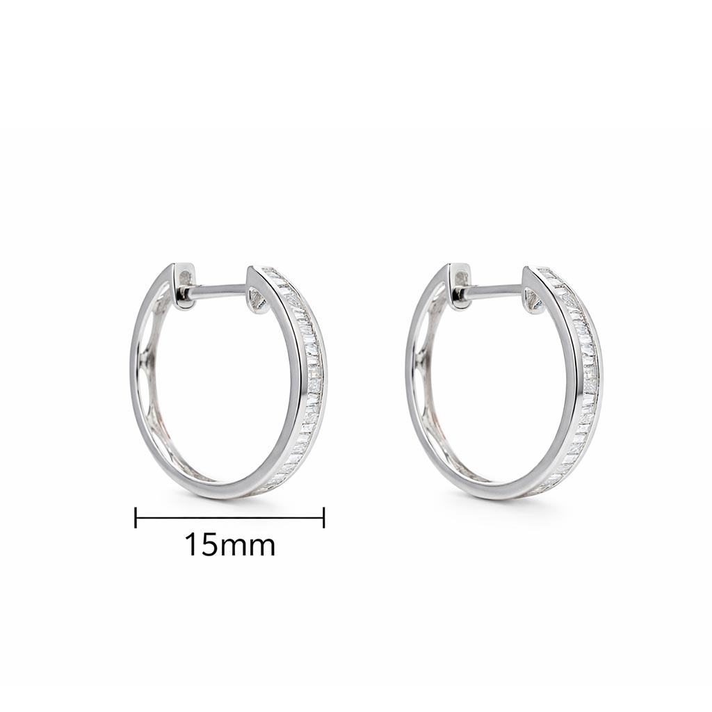 Argollas de oro blanco 18k con diamantes en corte baguette engastadas en riel, con 0.16ct en total. 15 milimetros de diametro.