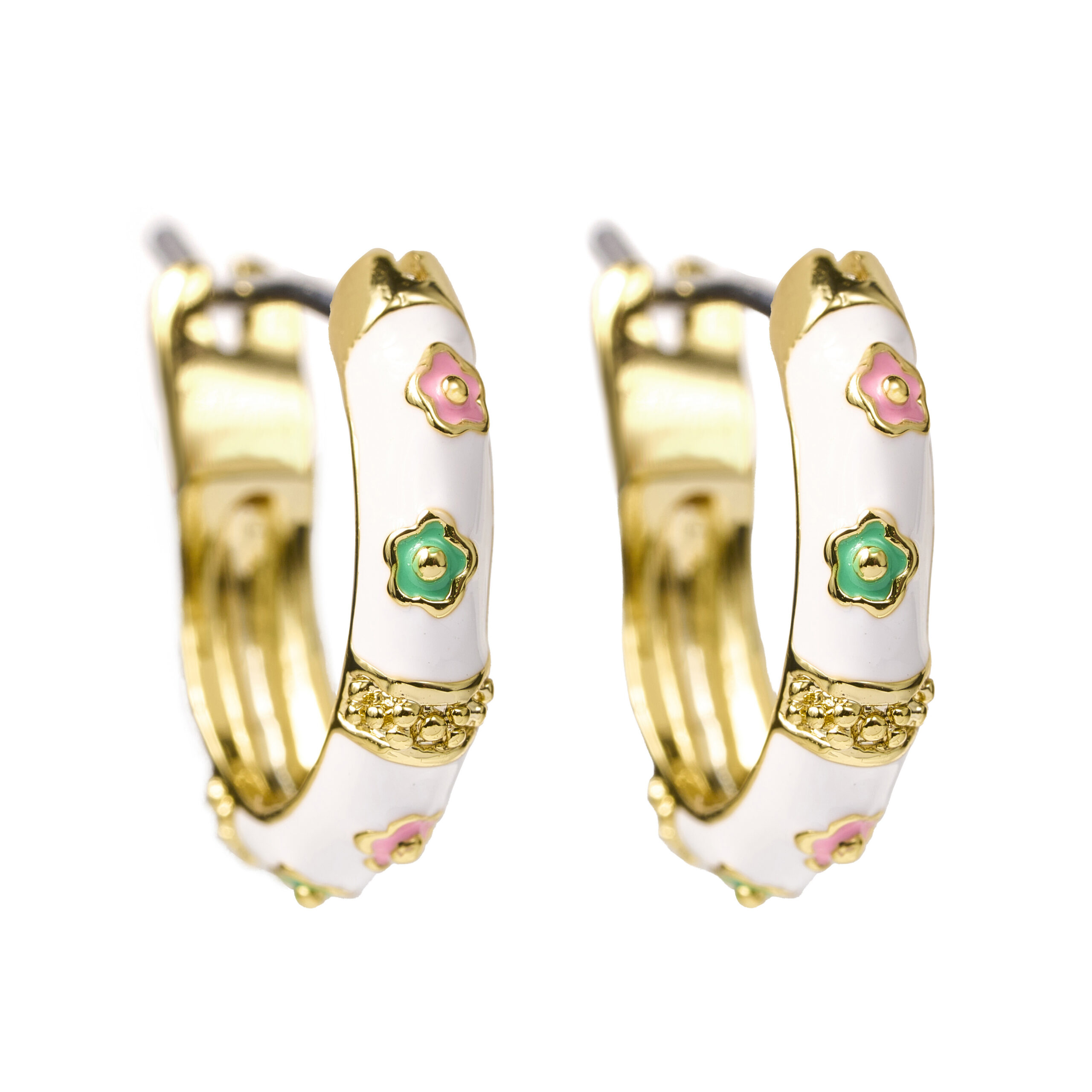 aros de plata esterlina con recubrimiento en oro amarillo 18k con esmalte italiano blanco y en tonos rosa y verde con flores y cierre italiano.