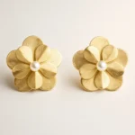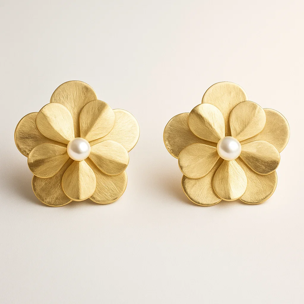 Aros de Plata esterlina 925 con un recubrimiento en oro amarillo 18k con diseño de flor y en centro una perla natural de 4mm aplanáda. Tamaño 50mm